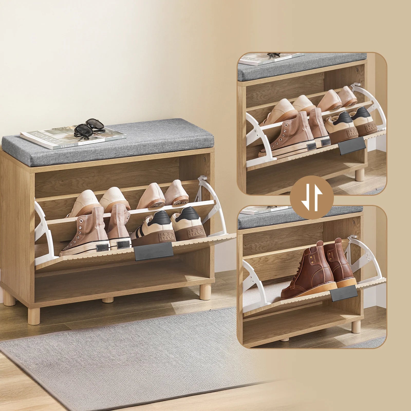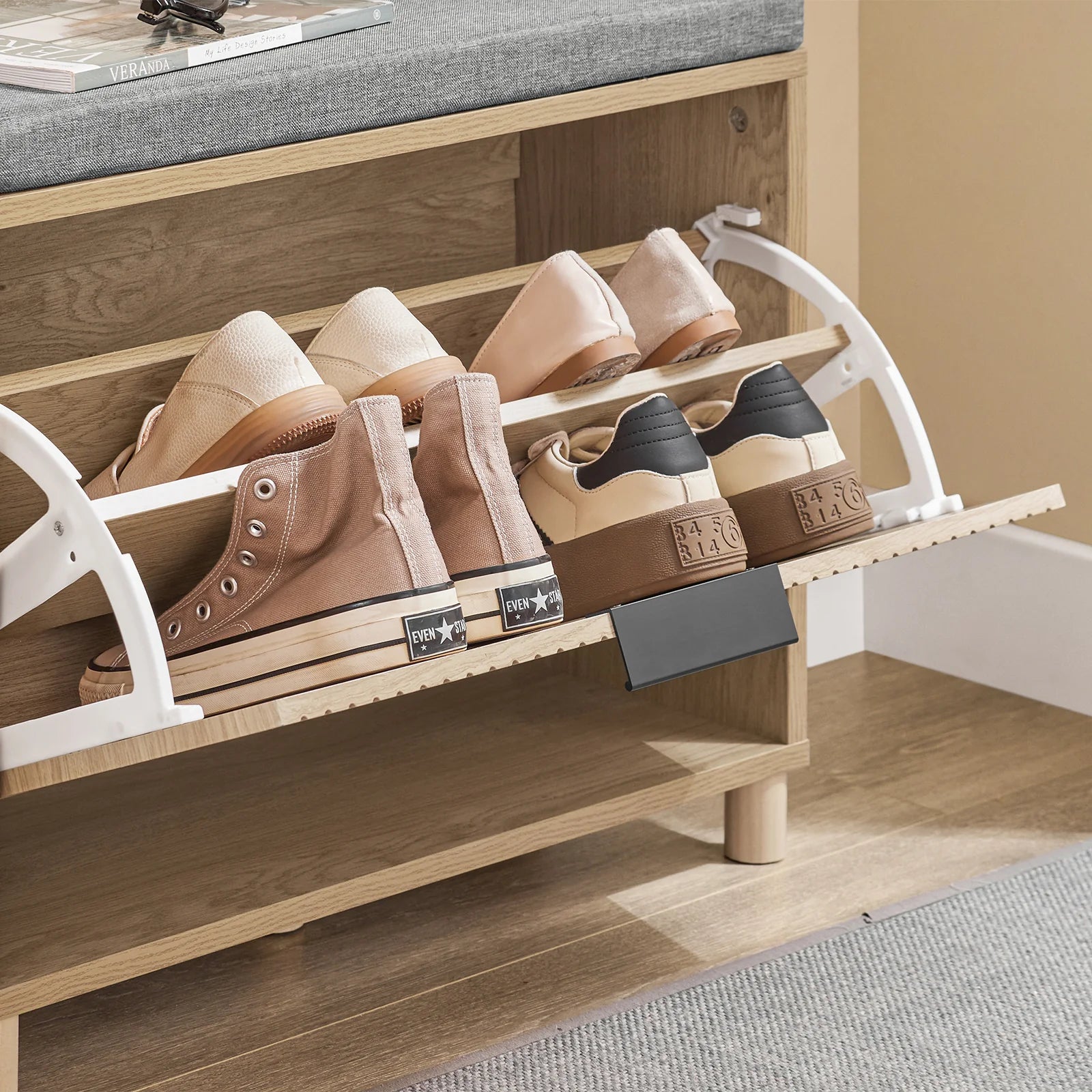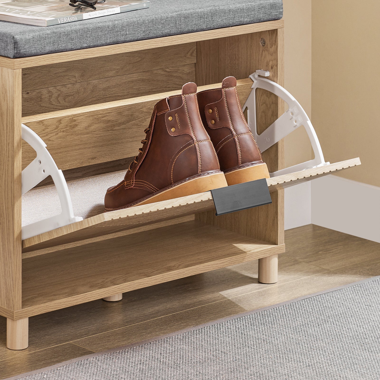 Den bløde, grå polstrede hynde giver en behagelig siddeplads, når du tager sko på eller af. Bænken har et udfoldeligt rum, som giver dig mulighed for at opbevare op til 4 par sko diskret og støvfrit.