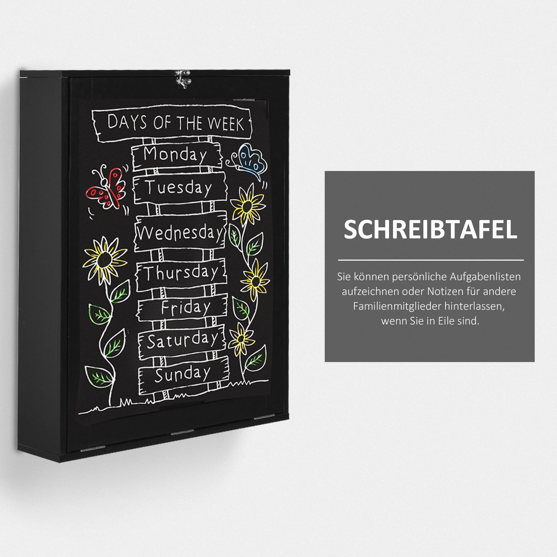 Væghylden med klapbord er ideel til små rum. Når den ikke er i brug, kan bordpladen nemt foldes op og forvandles til en væghylde. De fem rum bagved kan bruges til opbevaring af kontorartikler eller andre genstande, mens skrivetavlen er perfekt til at skrive vigtige noter ned.