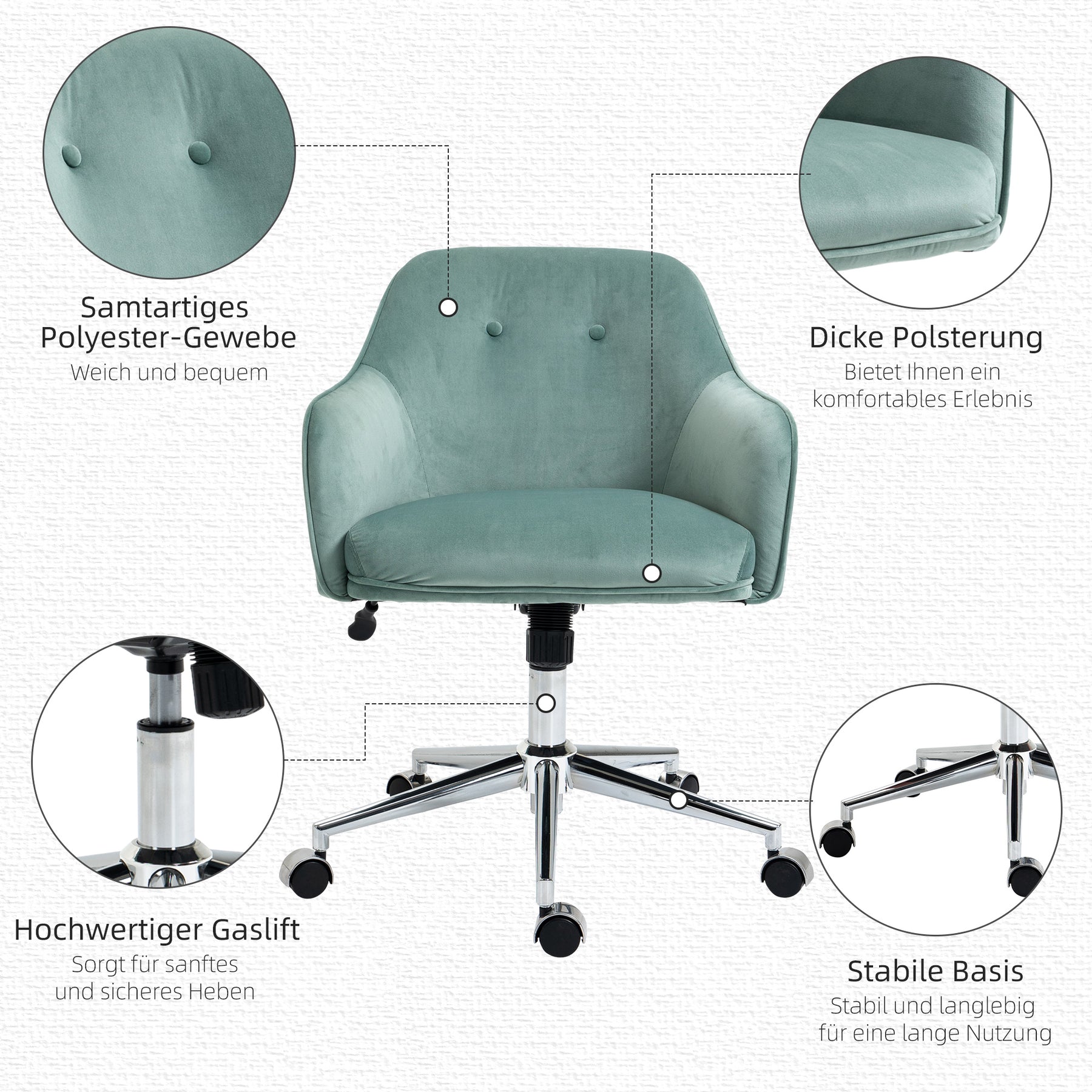 Kontorstol med knaplukning, højdejusterbar, gyngefunktion, fløjlslook, 61 cm x 59 cm x 90,5 cm, turkis