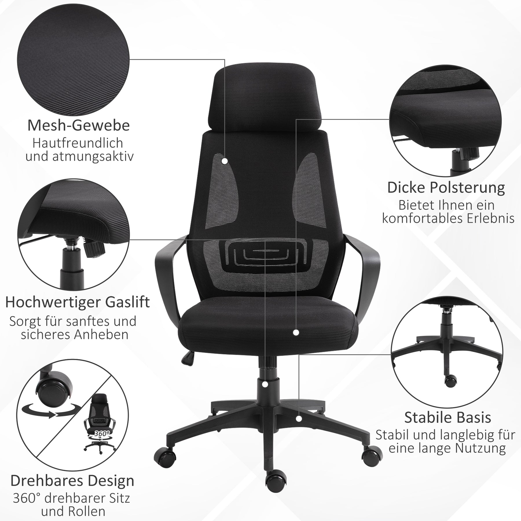 Kontorstol, skrivebordsstol med vippefunktion, højdejusterbar med nakkestøtte, lændestøtte, sort