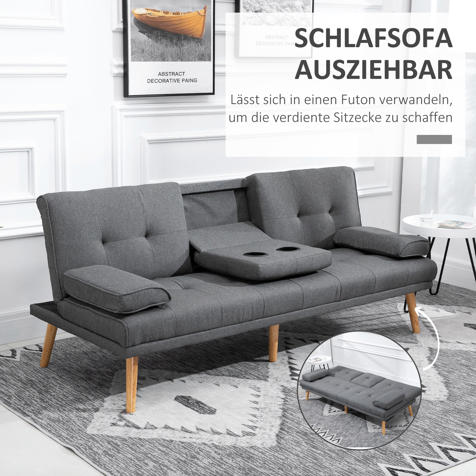 Med en robust ramme og solide træsben tilbyder denne sovesofa både stabilitet og maksimal komfort. Den midterste del af ryglænet kan endda konverteres til et praktisk sidebord med kopholdere, hvilket tilføjer ekstra bekvemmelighed.