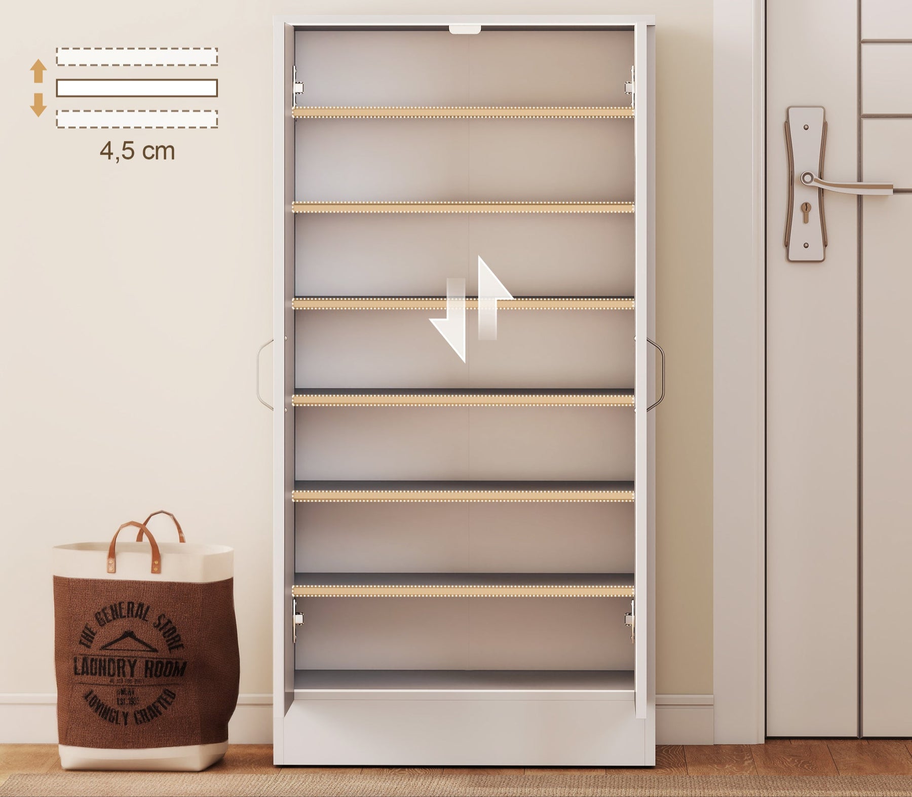 Opdag det perfekte skoskab med seks justerbare hylder, ideelt til alle typer sko, fra sneakers til støvler. Med stille dæmpende hængsler kan du nyde en rolig atmosfære, og det veltedesikre design gør det sikkert i hjem med børn.