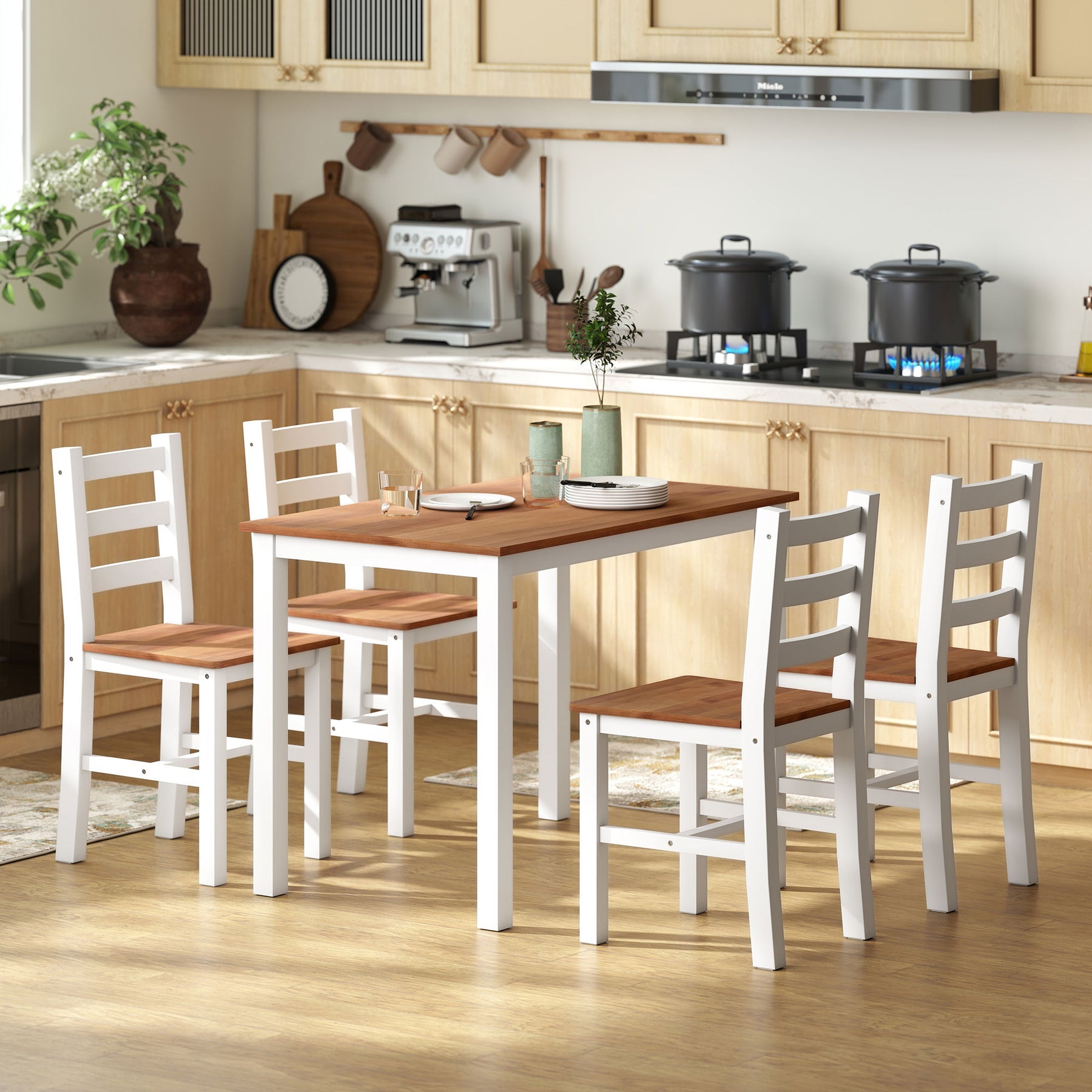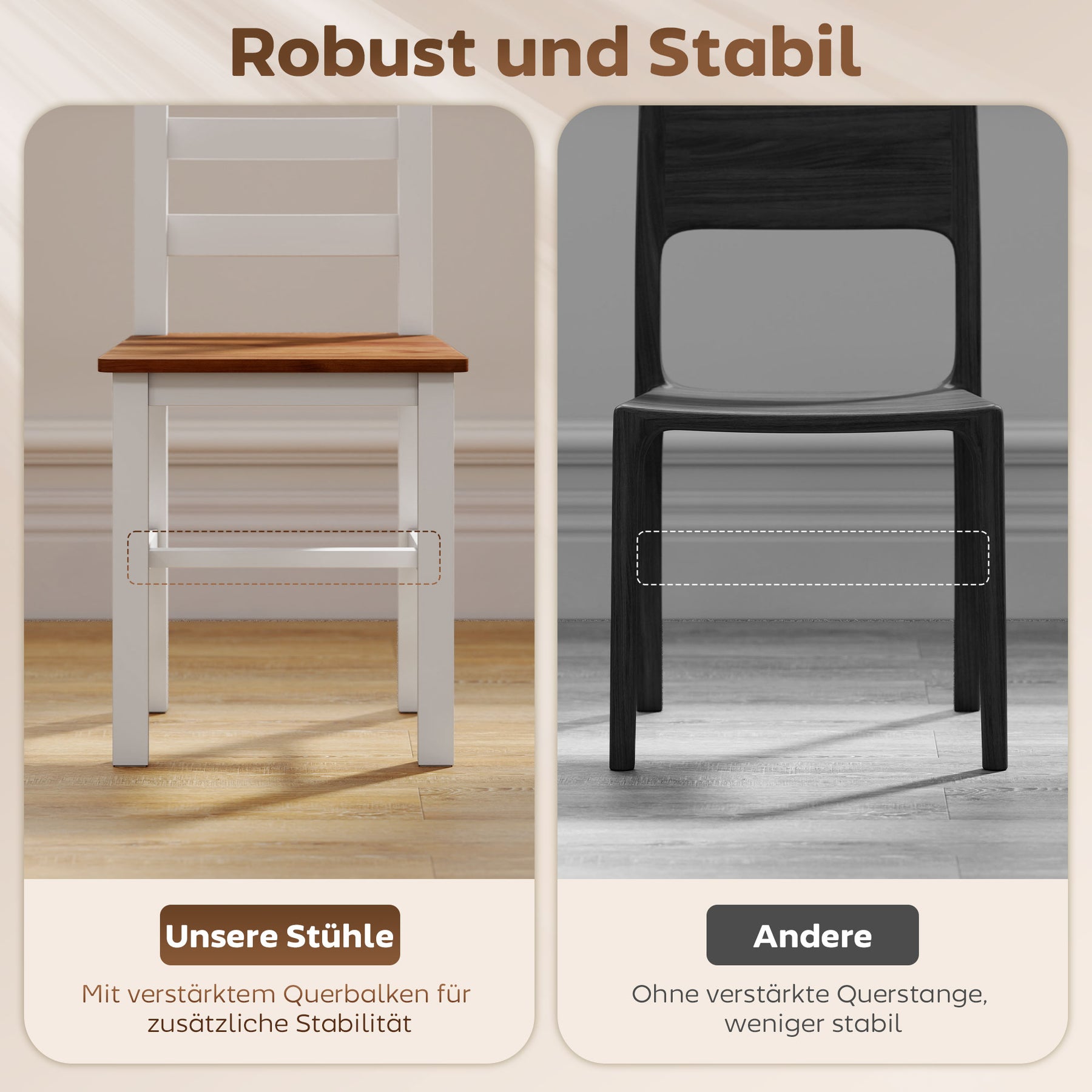 Oplev en ryddelig spiseplads med dette spisebordssæt, hvor stolene nemt kan skubbes ind under bordet, perfekt til små rum. Den varme brune farve og de klare hvide ben tilfører rustik charme til dit køkken. Sættet er lavet af massiv fyr, som giver holdbarhed og en naturlig atmosfære, der stilfuldt forbedrer dine måltider med venner og familie.