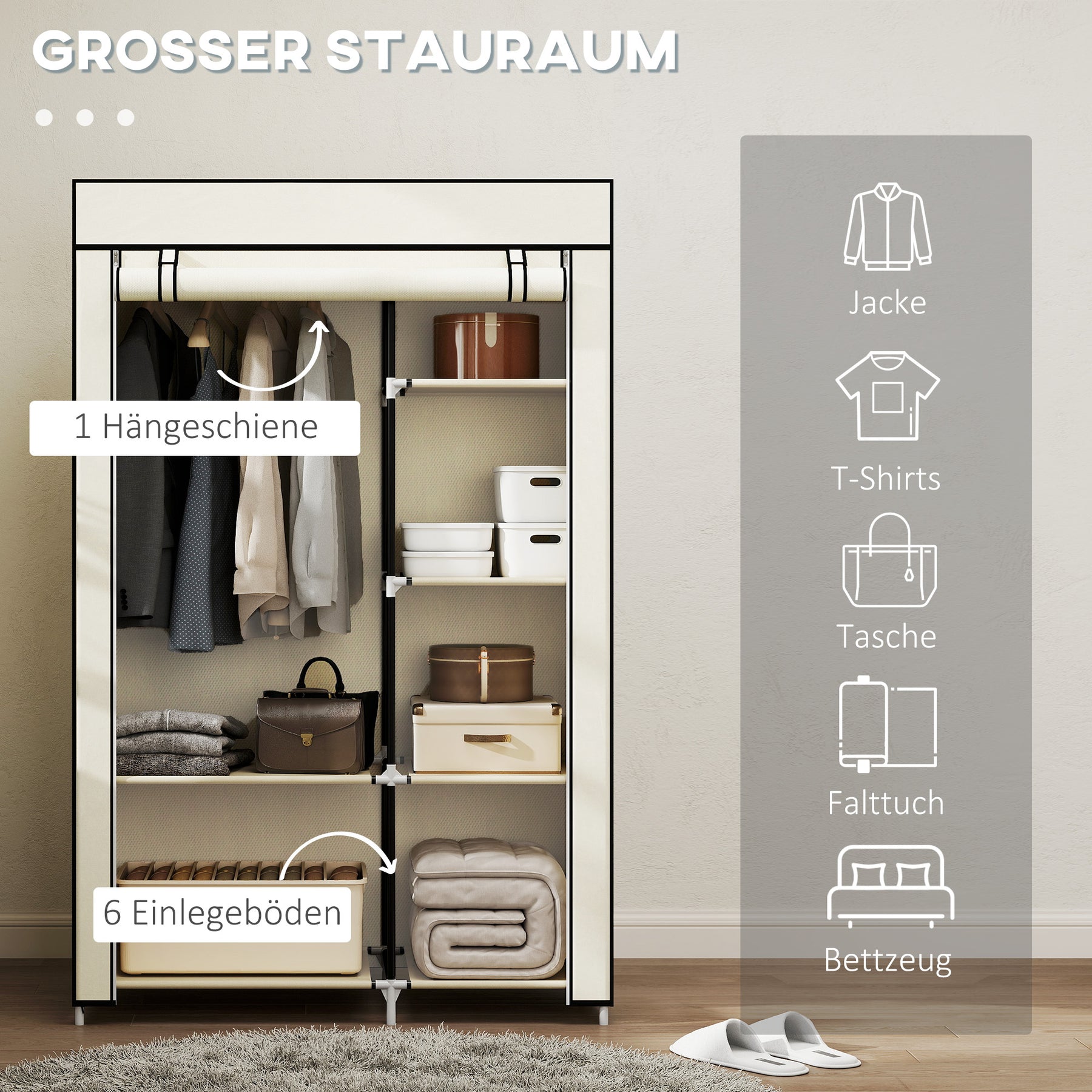 Hold dit hjem organiseret med dette alsidige stofgarderobeskab, perfekt til ethvert rum, der har brug for ekstra opbevaring. Med en bøjle og seks hylder tilbyder det en ideel løsning til opbevaring af tøj, håndklæder, sengetøj eller tasker og beskytter dine ejendele mod støv.