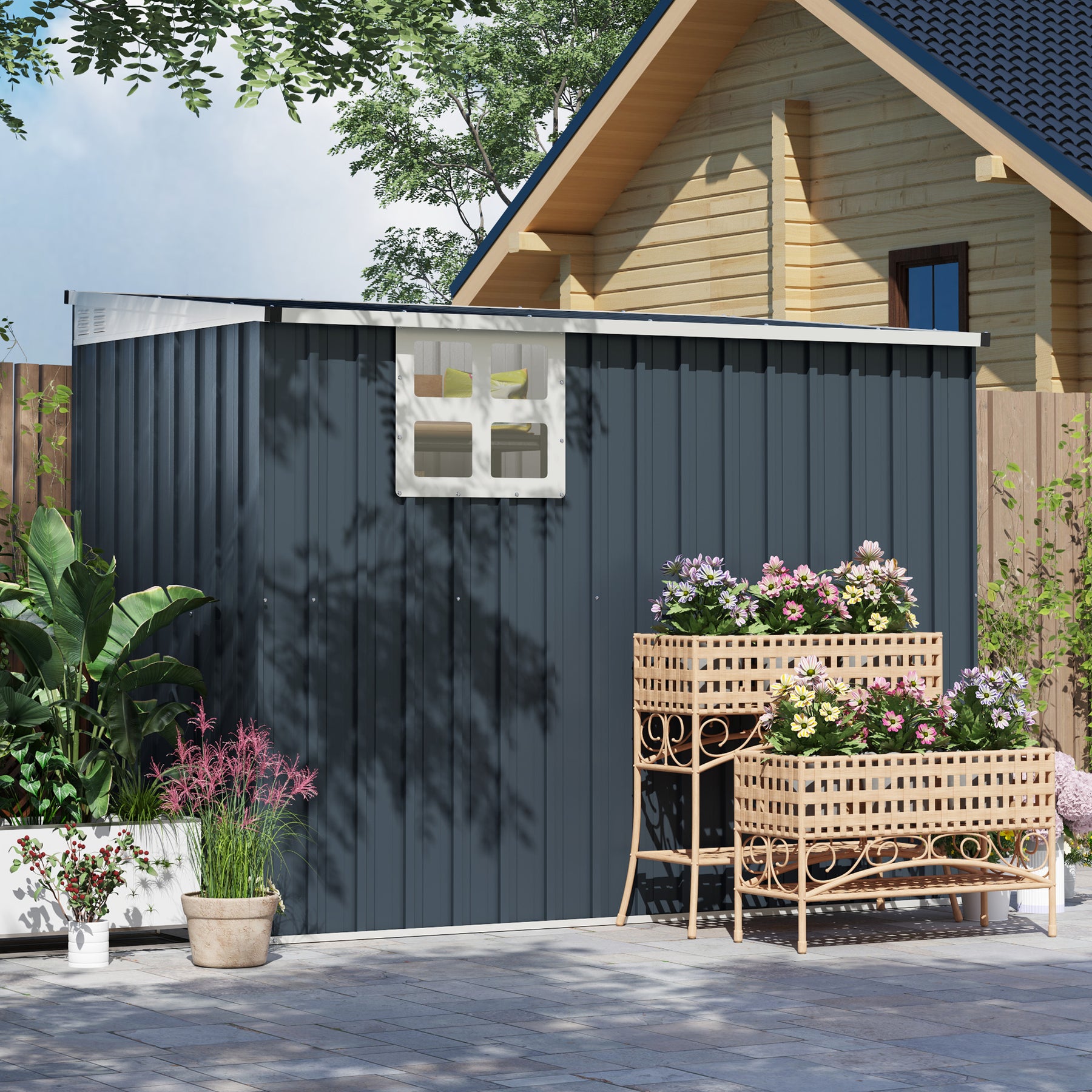 Dette haveredskabsskur er designet til at holde dine værktøjer godt opbevaret og beskyttet. Med dobbelte ventilationsåbninger og et gennemsigtigt vindue får du naturligt lys og optimal luftcirkulation. Den aflåselige dør sikrer, at dine ting er trygge, mens det skrånende tag beskytter mod vandmætning.