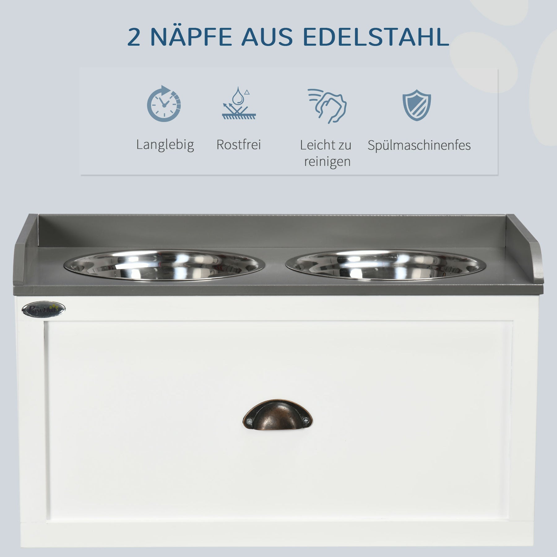 Foderstation, 2 skåle (2 liter hver), rustfrit stål, med skuffe, til store hunde, hvid+grå, 60 x 30 x 36 cm