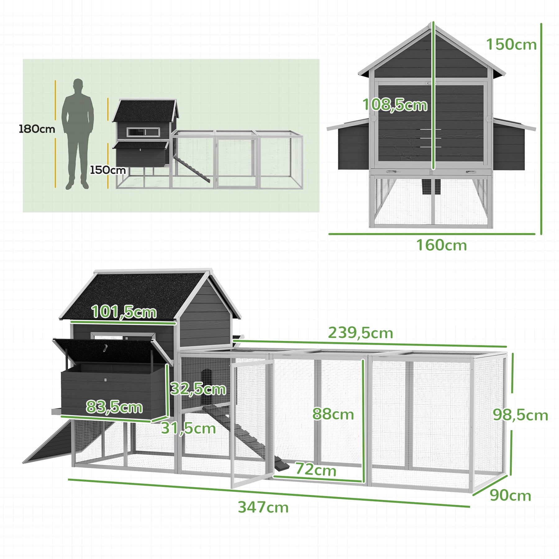 - Samlede dimensioner: 347L x 160B x 150H cm