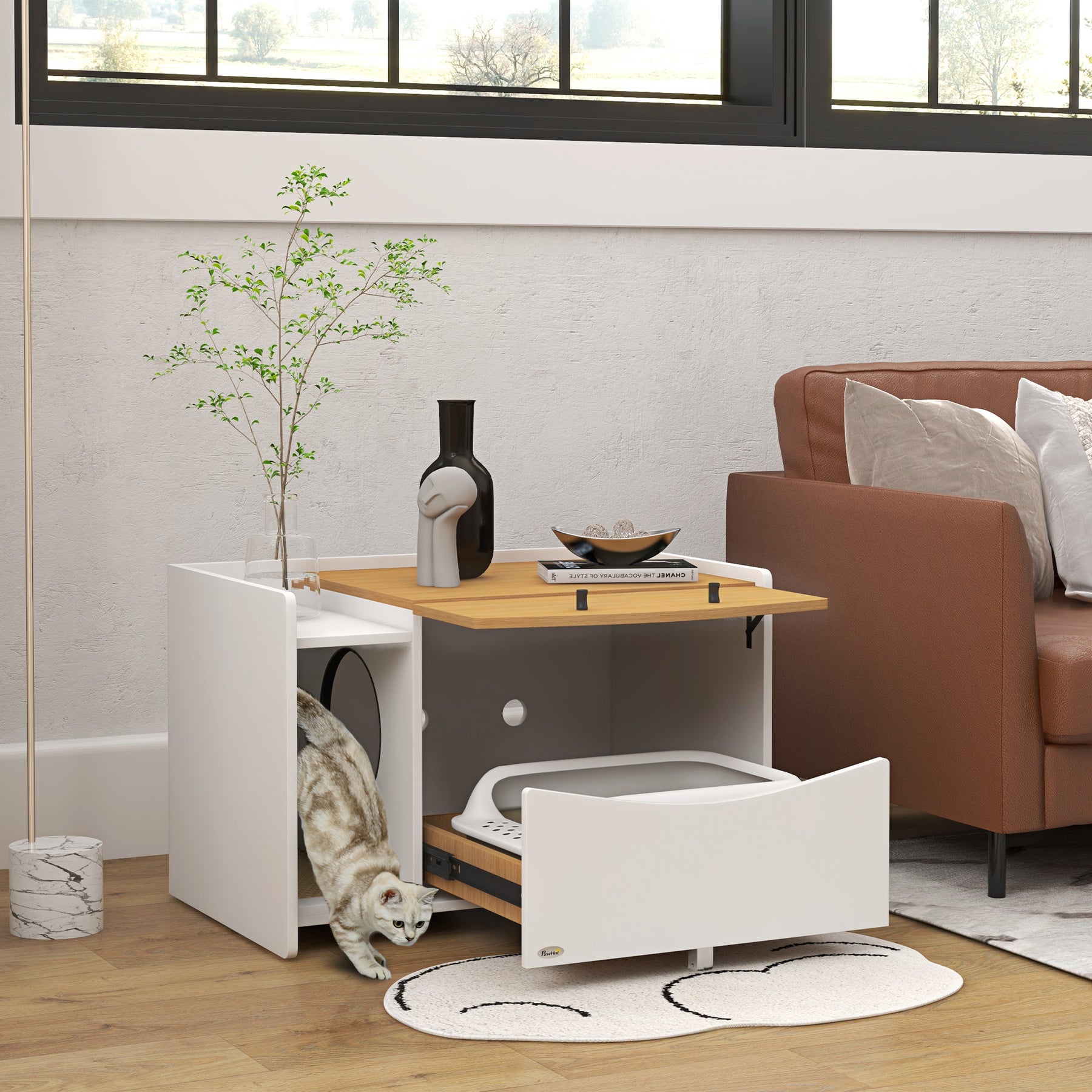 Forvandl din kats kattebakke til et stilfuldt møbel med dette elegante kattebakkeskab. Det fungerer også som et sidebord og skjuler smart kattebakken, hvilket gør det til den ideelle løsning for katteejere, der værdsætter orden og renlighed.