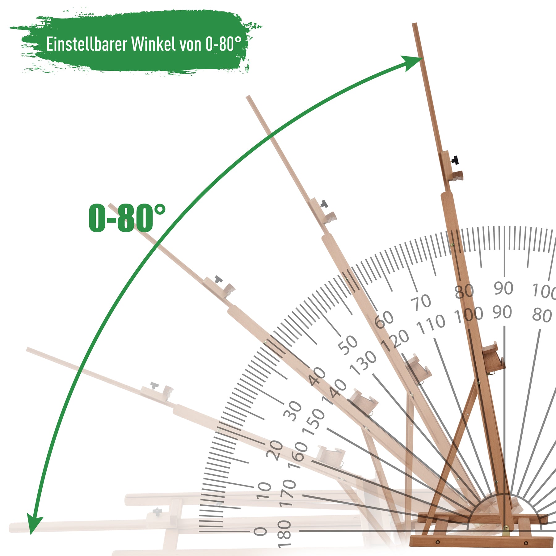 Oplev det perfekte mix af funktionalitet og æstetik med dette staffeli i høj kvalitet. Ideelt til både maleri og udstilling af kunstværker, kan vinklen justeres fra 0 til 80 grader for optimal komfort. Den justerbare højde gør det muligt at arbejde både siddende og stående.