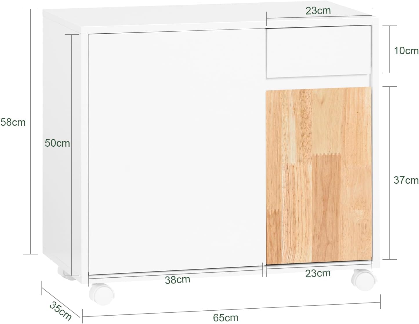 Vognen har en stor bordplade, der er velegnet til en printer eller scanner. Skuffen er perfekt til opbevaring af småting som papirvarer, nøgler og tilbehør. Bag de to skabslåger finder du masser af plads til dokumenter, mapper og bøger. Venstre skab har desuden to separate rum, som maksimerer opbevaringspladsen.
