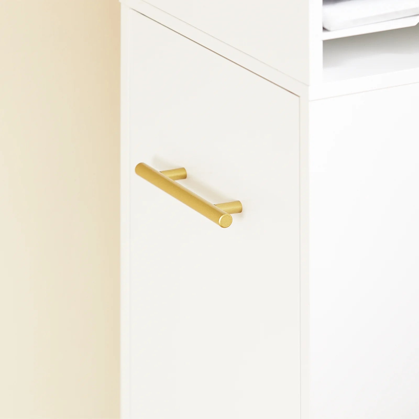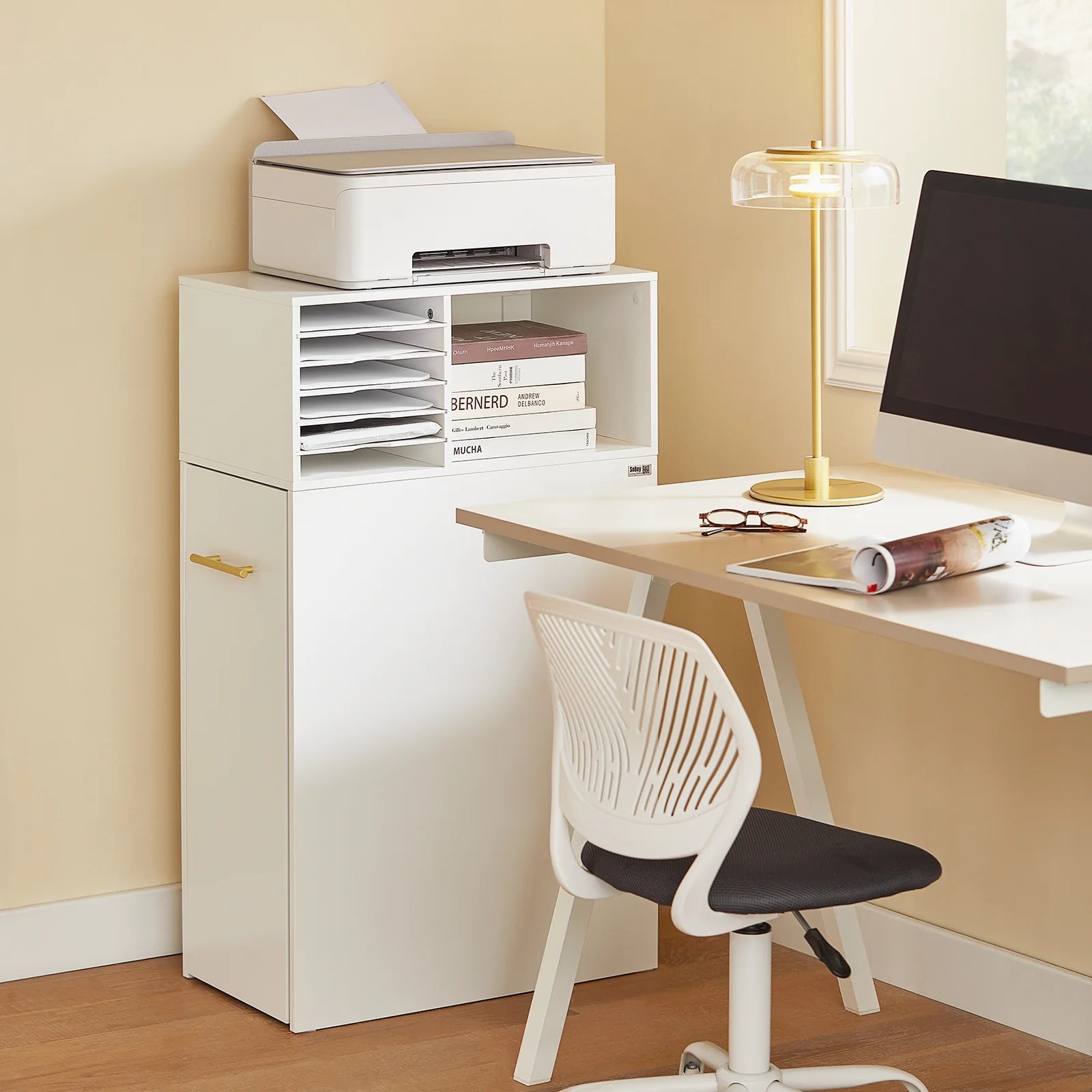 Dette smarte møbel er designet i to dele: et skab og en reol på hjul. På den øverste hylde kan du nemt placere din printer, billeder, dekorationer og meget mere. De to åbne rum nedenunder giver rigelig opbevaringsplads til andre småting, bøger, billeder eller pynt.