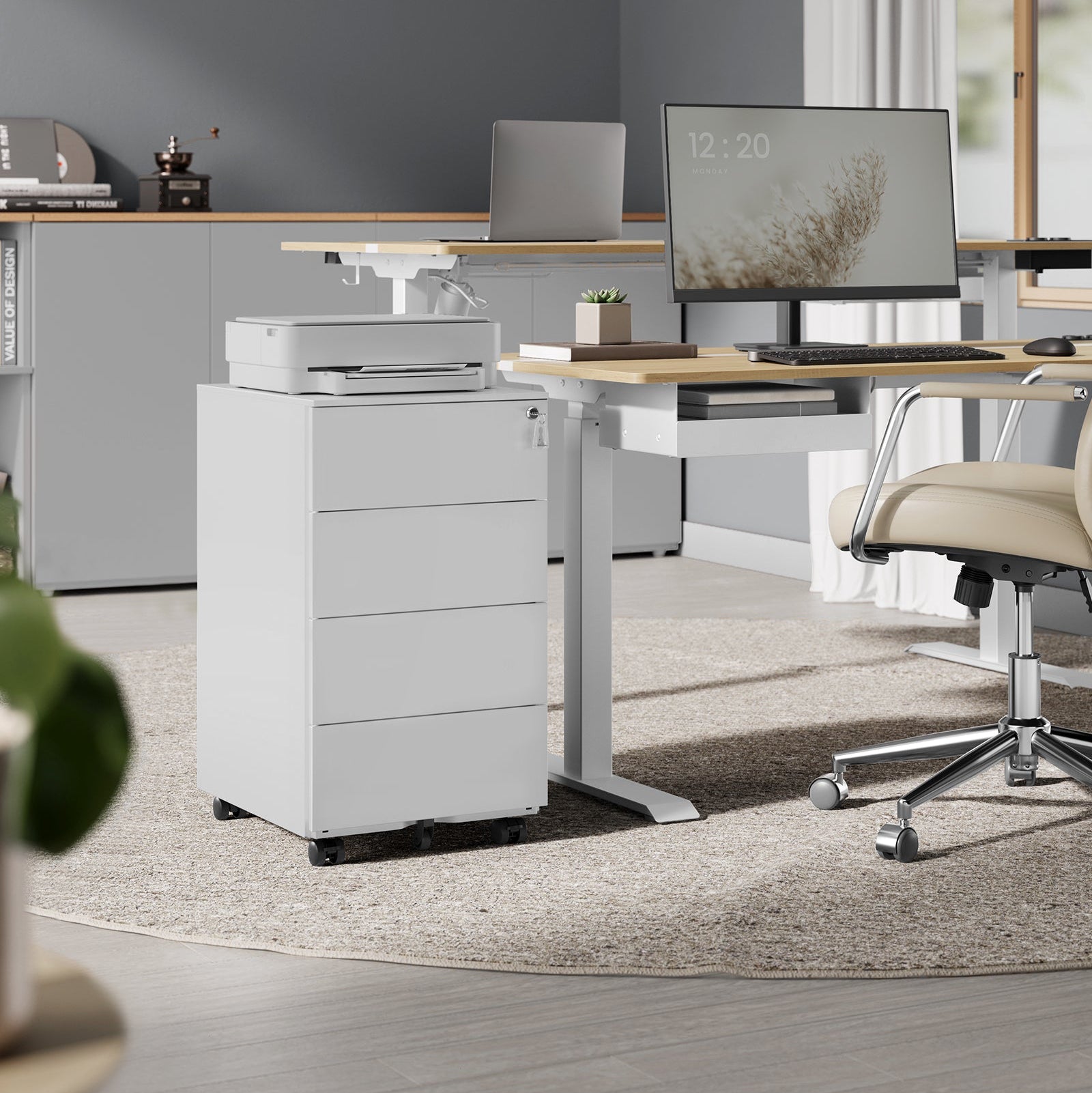 Er dit skrivebord en uoverskuelig rodebunke? Dette arkivskab med fire skuffer er den perfekte løsning til at skabe ro og orden i dit hjemmekontor. Det er designet til at forenkle din arbejdsdag, og den praktiske bakke på toppen holder dine vigtigste redskaber som sedler og clips lige ved hånden.