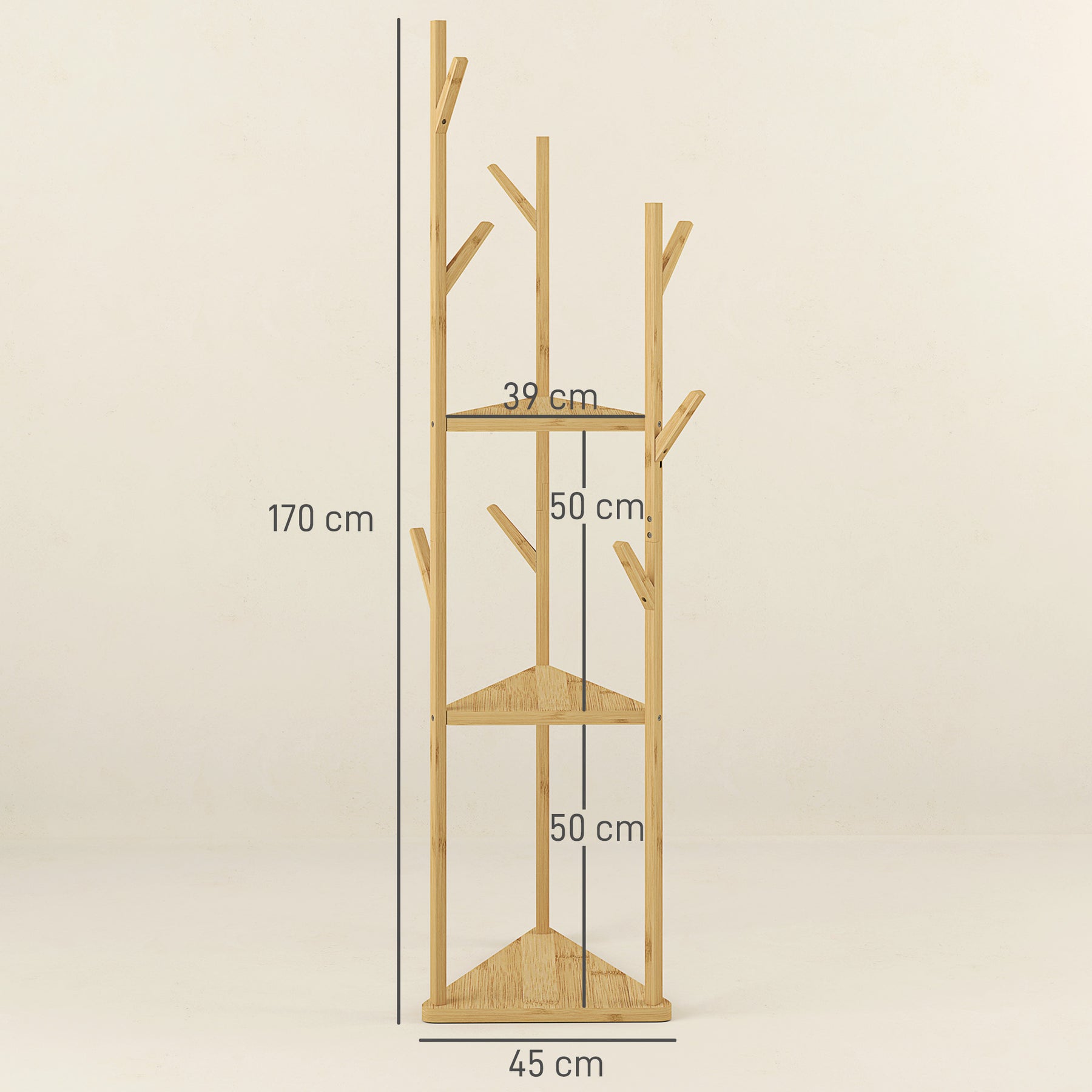 Oplev magien ved den fritstående frakkehylde: en perfekt blanding af stil og funktion. Denne bambusfrakkehylde er formet som et træ med en lys, ren finish og fungerer også som et elegant dekorativt element. Ni kroge og tre hylder giver rigelig plads, mens den trekantede base sikrer stabilitet overalt i dit hjem eller kontor.