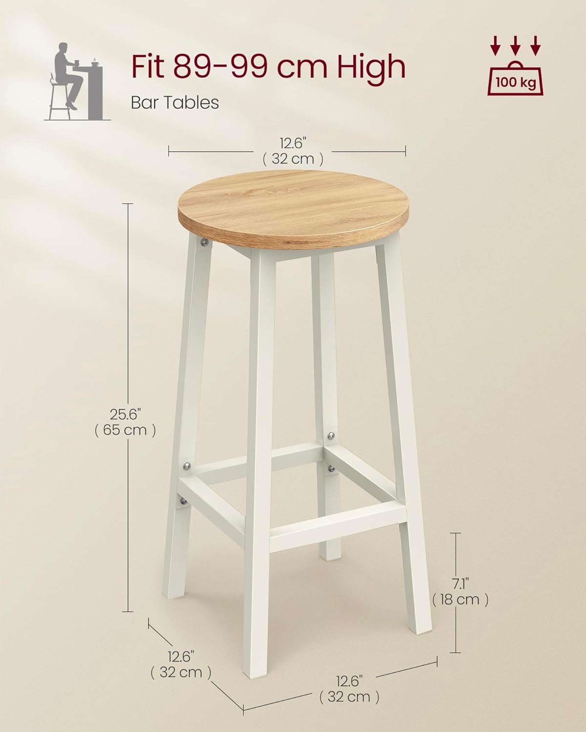 Disse barstole er ikke kun flotte, de er også bygget til at holde. Fremstillet af spånplade af høj kvalitet og et robust metalstel med fodstøtte, sikrer de høj stabilitet. Hver stol kan bære op til 100 kg, og de skridsikre fødder gør dem sikre at sidde på og beskytter samtidig dit gulv.