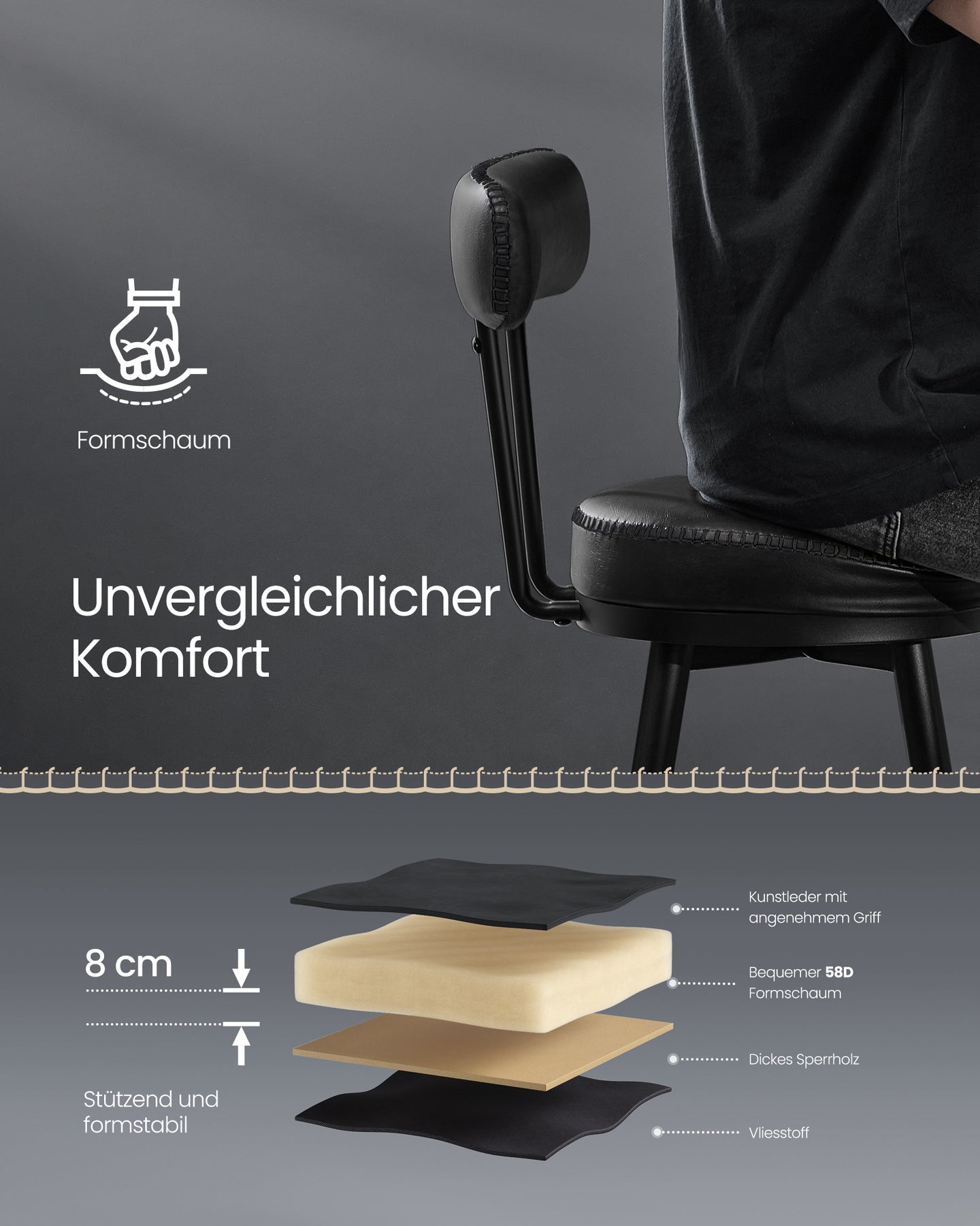 Oplev en komfort du ikke vil rejse dig fra. Barstolenes sæde er dækket af glat kunstlæder, og den 8 cm tykke 58D-støbte skum giver en blød og støttende siddeoplevelse, der varer ved. Den robuste konstruktion sikrer, at disse stole kan modstå tidens tand og bevare deres komfort, uanset hvor ofte de bruges.