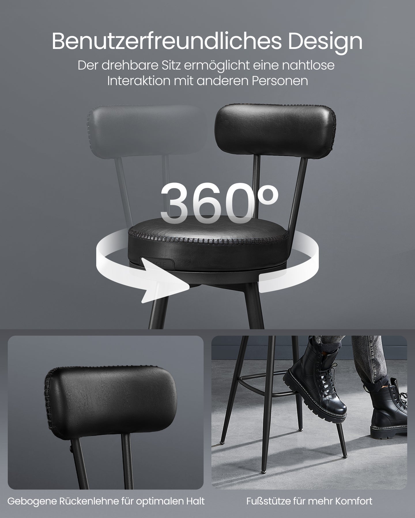 Med en 360° drejefunktion kan du nemt vende dig og deltage i samtaler med alle omkring dig. Uanset om det er i køkkenet, hjemmebaren eller et selskabslokale, bliver hvert socialt arrangement en succes. Denne funktion giver dig fuld bevægelsesfrihed og gør barstolen ideel til både afslappede og festlige lejligheder.
