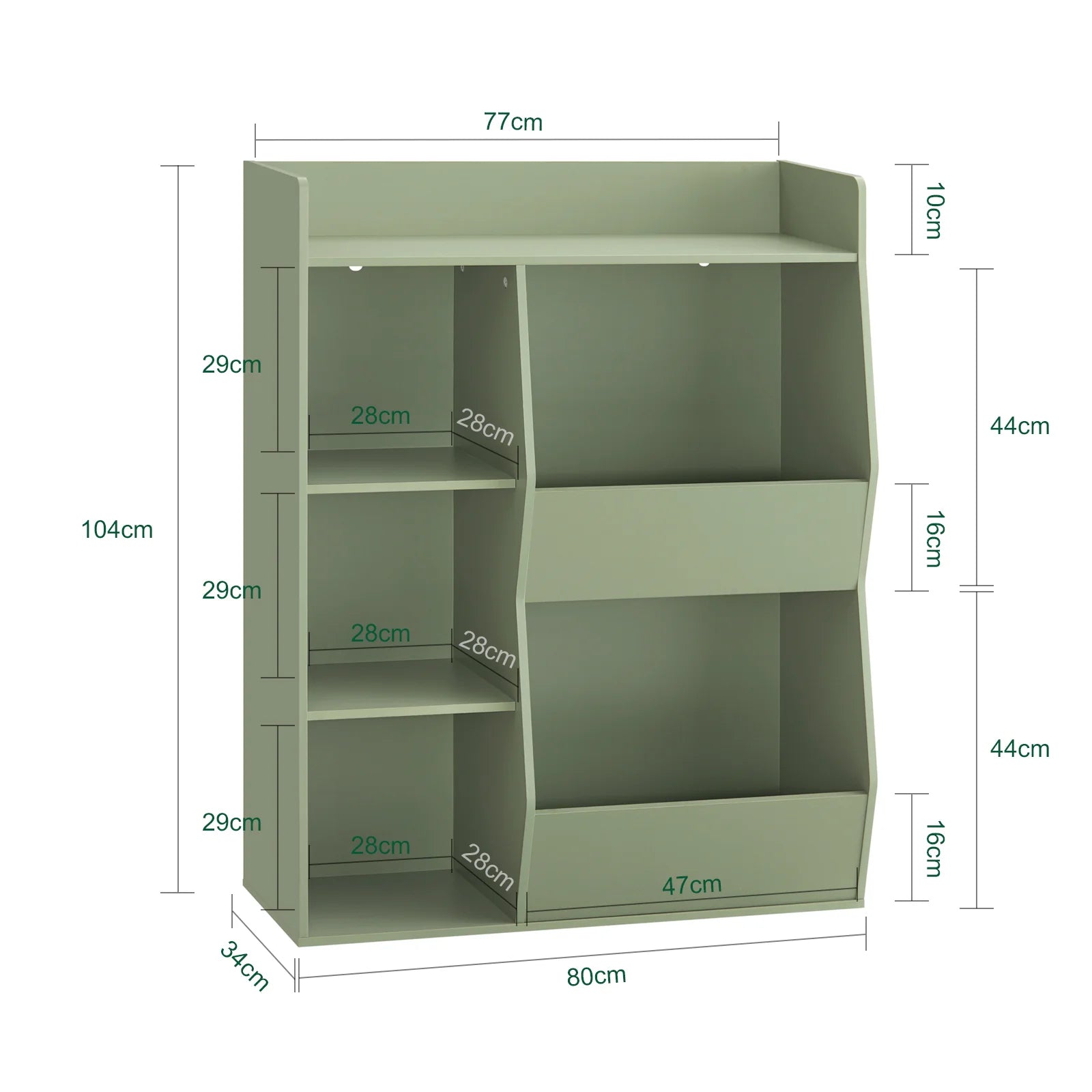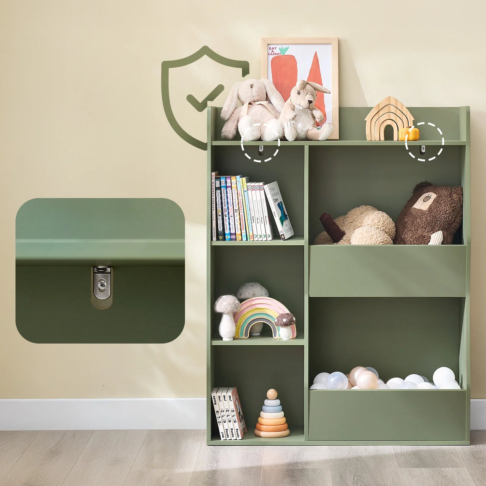Bogreolen er designet med barnets sikkerhed for øje – afrundede hjørner og kanter samt et tipbeskyttelsessystem sikrer tryghed under leg og bevægelse. Med en højde på 104 cm kan børn nemt nå alt og lære selvstændighed samt orden fra en tidlig alder.