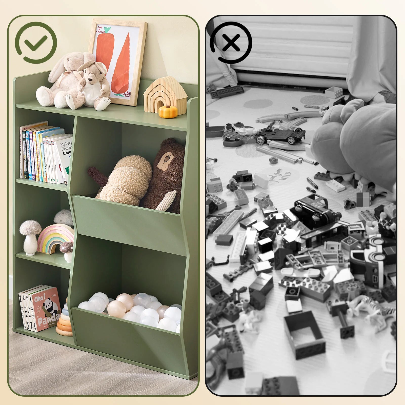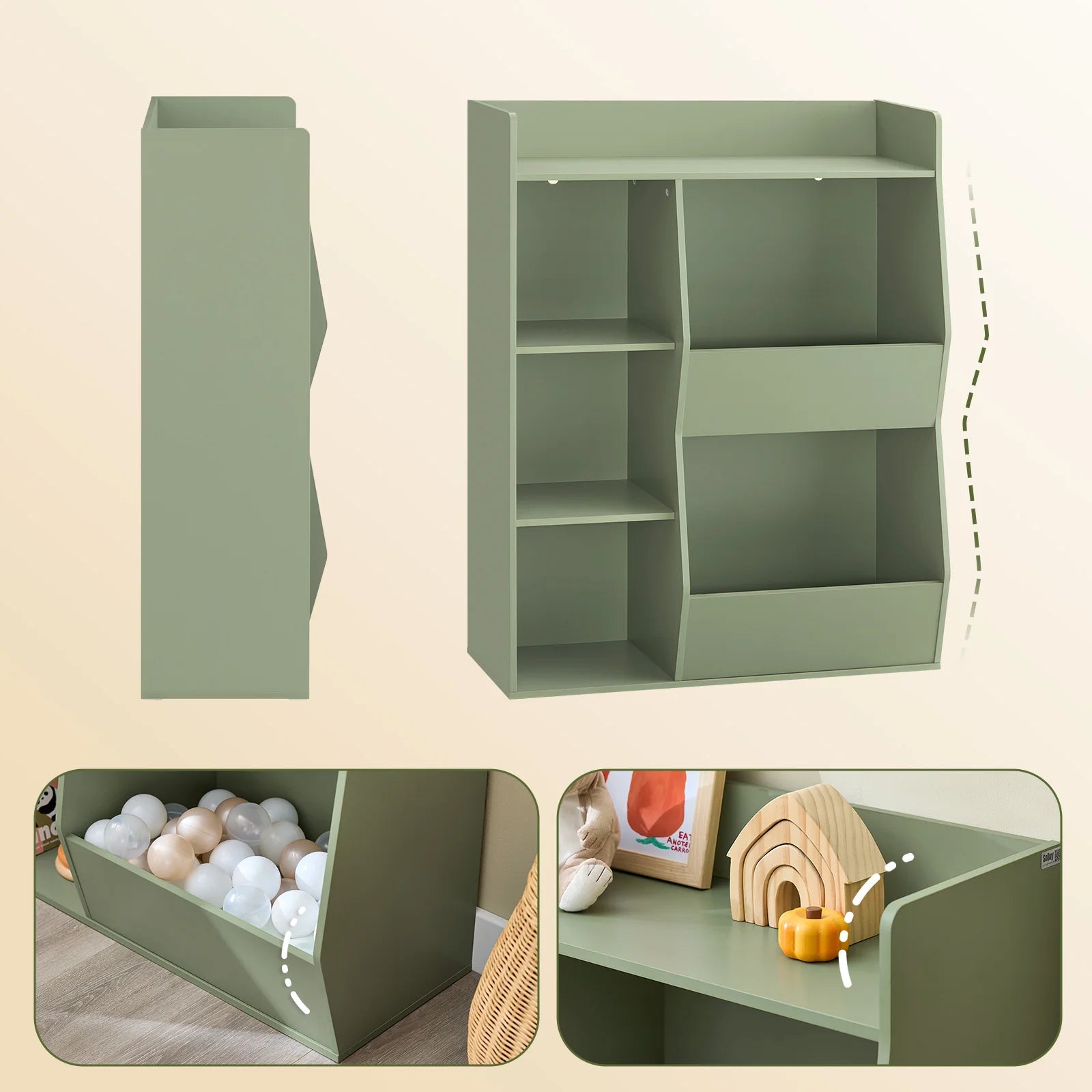 Giv dit barn en sikker og organiseret opbevaringsløsning med denne rummelige Montessori-bogreol, der er perfekt til børneværelset. Den har 5 åbne rum, som giver tydelig opbevaring af bøger, legetøj, bamser, billeder og andre favoritting.