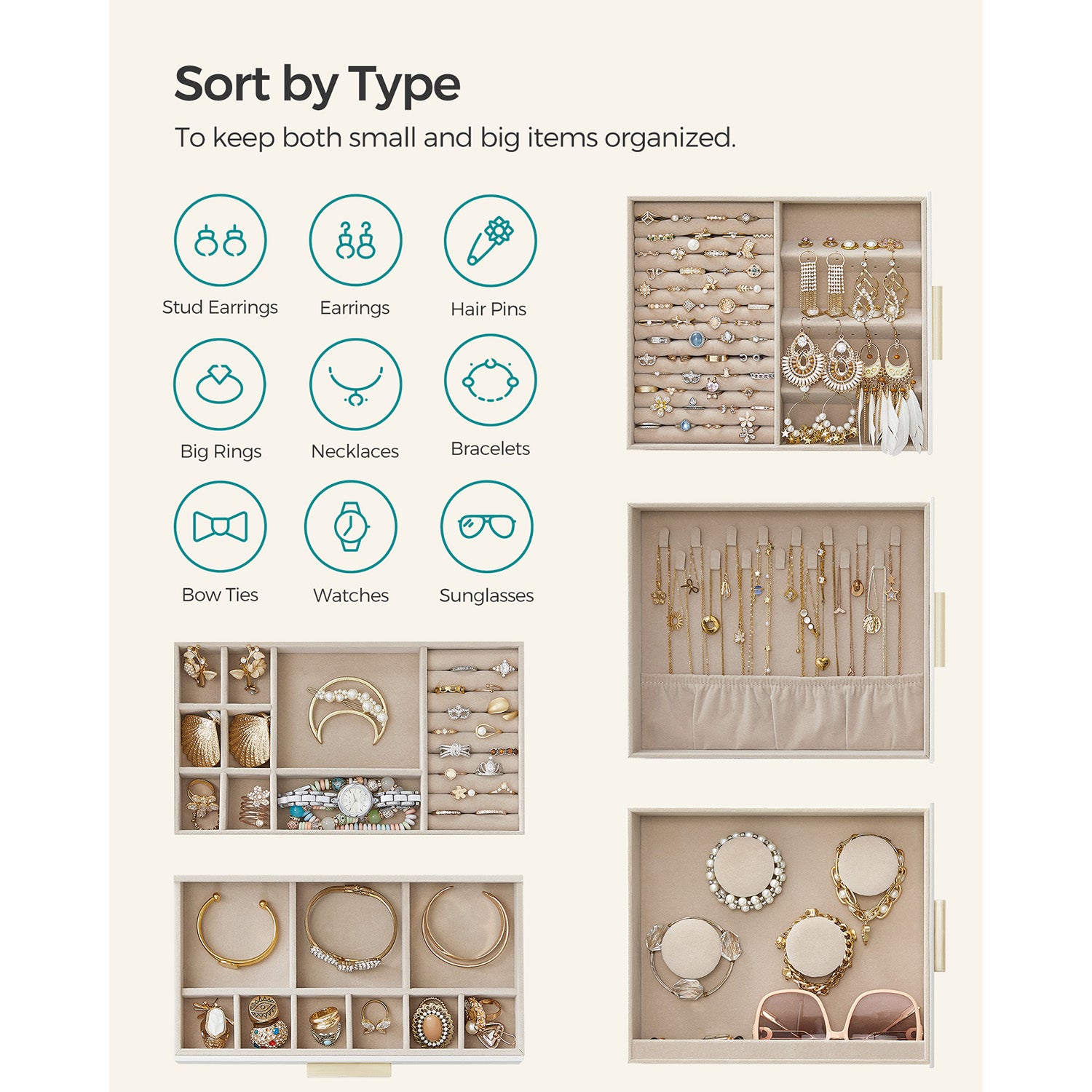 Smykkeskrinet har tre skuffer i siden, som du kan bytte rundt på, som du ønsker. Det giver dig mulighed for at fremvise forskellige smykker, mens de holdes støvfrie bag det klare glas. Her kan du hænge dine halskæder og øreringe for at undgå, at de filtrer sammen. Toprummet og den nederste skuffe er perfekte til opbevaring af brocher, hårnåle og andre accessories.