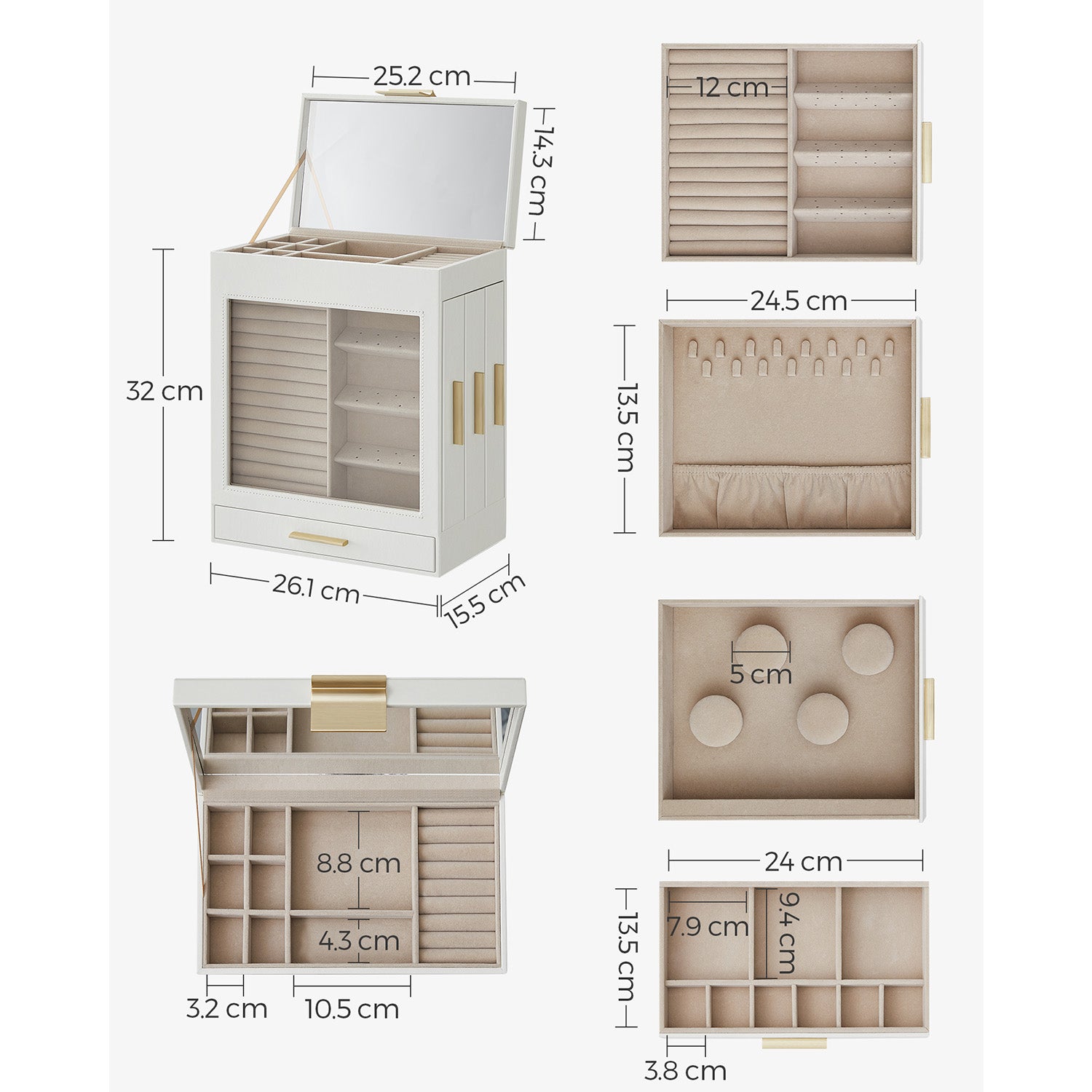 Når du åbner låget, finder du et stort spejl, der er utrolig praktisk, når du skal tjekke dine smykker, inden du tager afsted. Sminkebordet kombinerer elegante farver som hvid og guld med skinnende metalhåndtag, blødt fløjlsfor og flot syning. Materialerne i høj kvalitet, som PU og MDF, sikrer, at smykkeskrinet er både stilfuldt og holdbart.