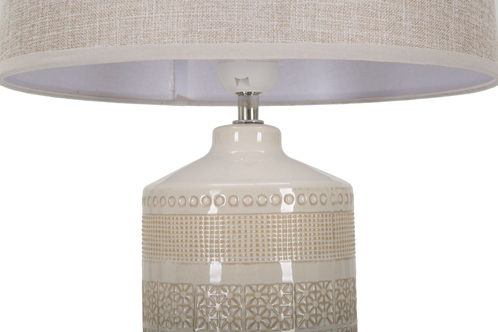 Med sin elegante base med geometriske relief-detaljer og en hvid stofskærm, tilfører lampen et unikt og stilfuldt touch til ethvert rum. Den cremehvide farve giver et stilfuldt og eksklusivt udtryk, der passer perfekt til en elegant og moderne indretning.