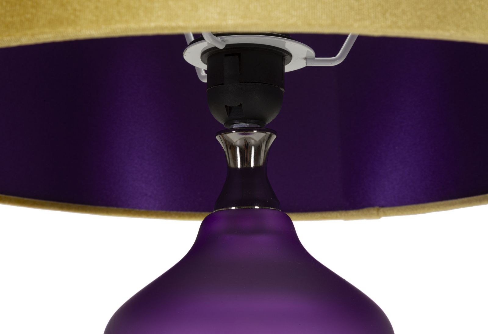 Med sin smukke, lilla glasbase og en raffineret skærm i gylden fløjl, skaber lampen et unikt og charmerende udtryk. Elegance blandes med mystik i et stemningsfuldt og varmt spil af lys og skygger.