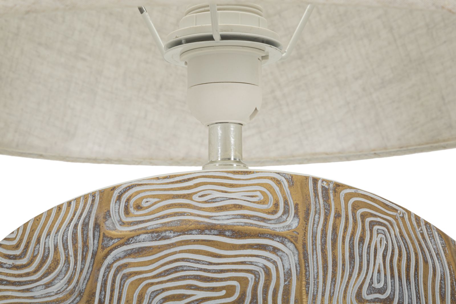 Lampens guldfarvede base er elegant dekoreret med geometriske dekorationer i relief, der giver et eksklusivt og stilfuldt udtryk. Den smukke base fuldendes af en klassisk, beige stofskærm, der skaber et blødt og behageligt lys.
