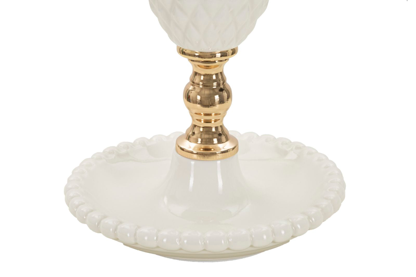 Med sin simple og elegante base i hvid keramik med gyldne detaljer og en matchende hvid stofskærm, tilfører lampen et luksuriøst og eksklusivt touch til ethvert rum. Den gyldne farve giver et stilfuldt og eksklusivt udtryk, der passer perfekt til en elegant indretning.
