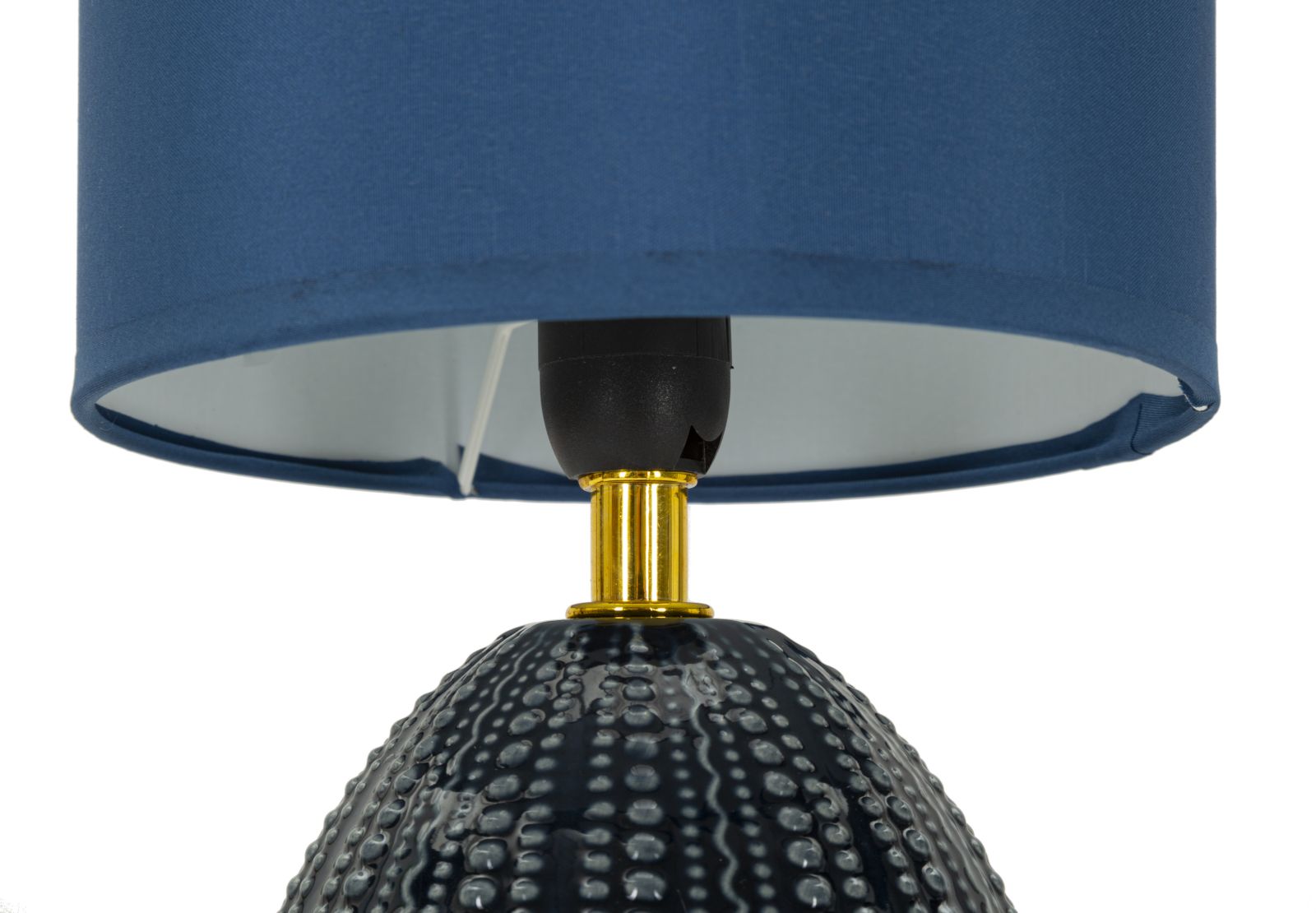 Med sin smukke, blå keramikbase har lampen et elegant design med uregelmæssige reliefdekorationer, der tilføjer et unikt og sofistikeret touch til dit miljø. Den fuldendes af en klassisk blå stofskærm, der skaber et blødt og behageligt lys.