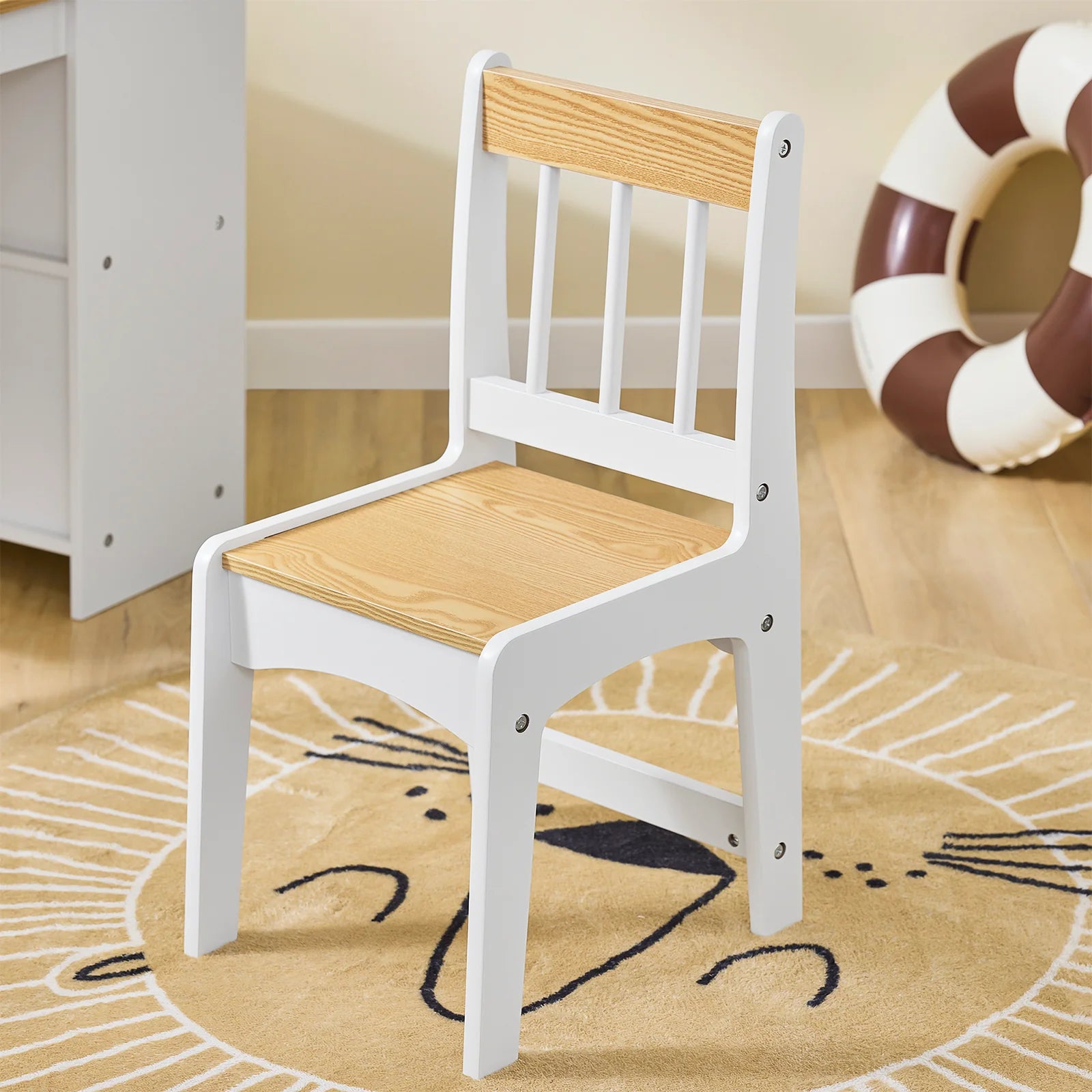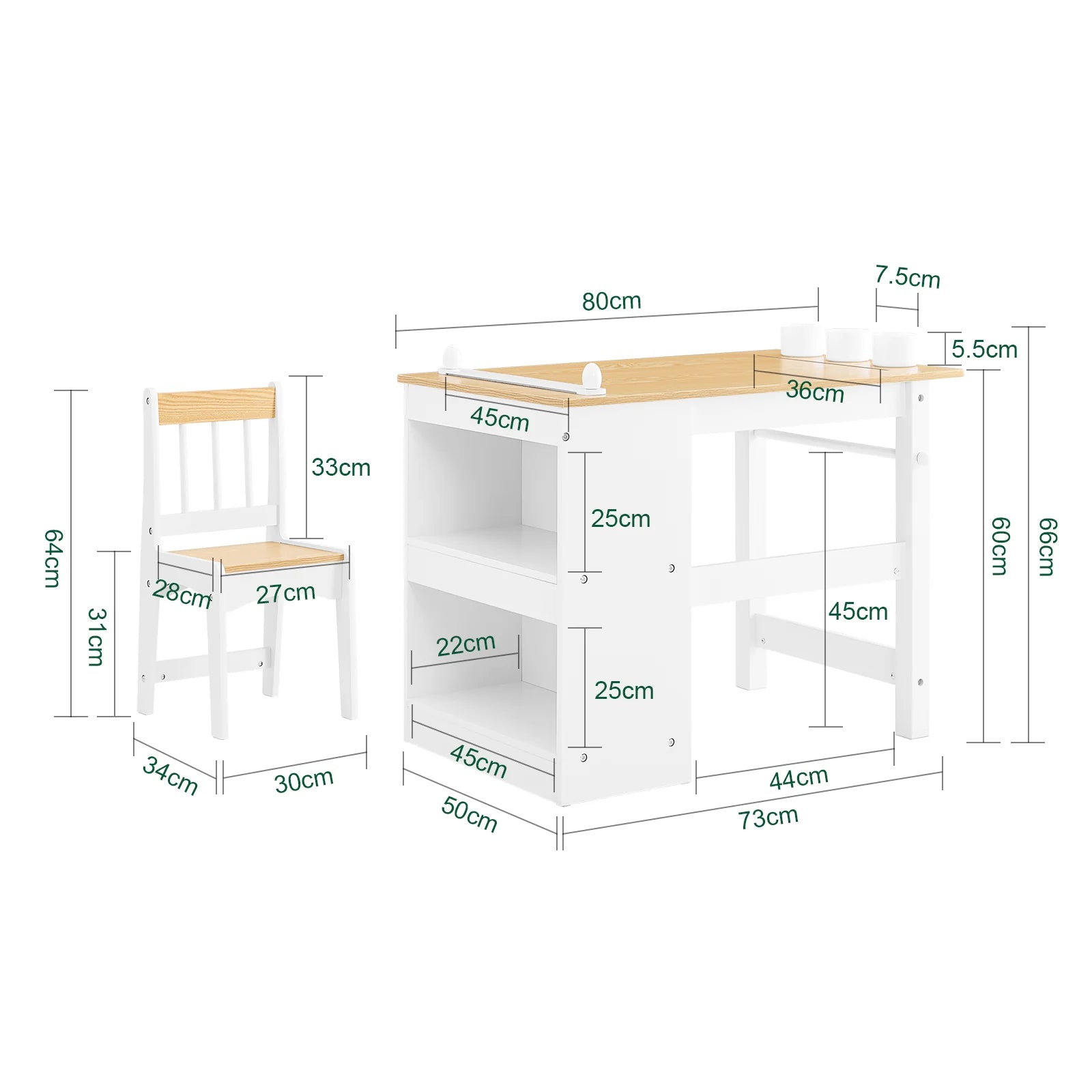 Giv dit barn et praktisk og kreativt sted at lære og lege med dette solide børnebord og stol sæt i MDF og fyrretræ. Det multifunktionelle bord har 2 opbevaringshylder til bøger, legetøj og kunstmaterialer, mens den stabile højryggede stol sikrer komfort og sikkerhed til børn fra 3 år.