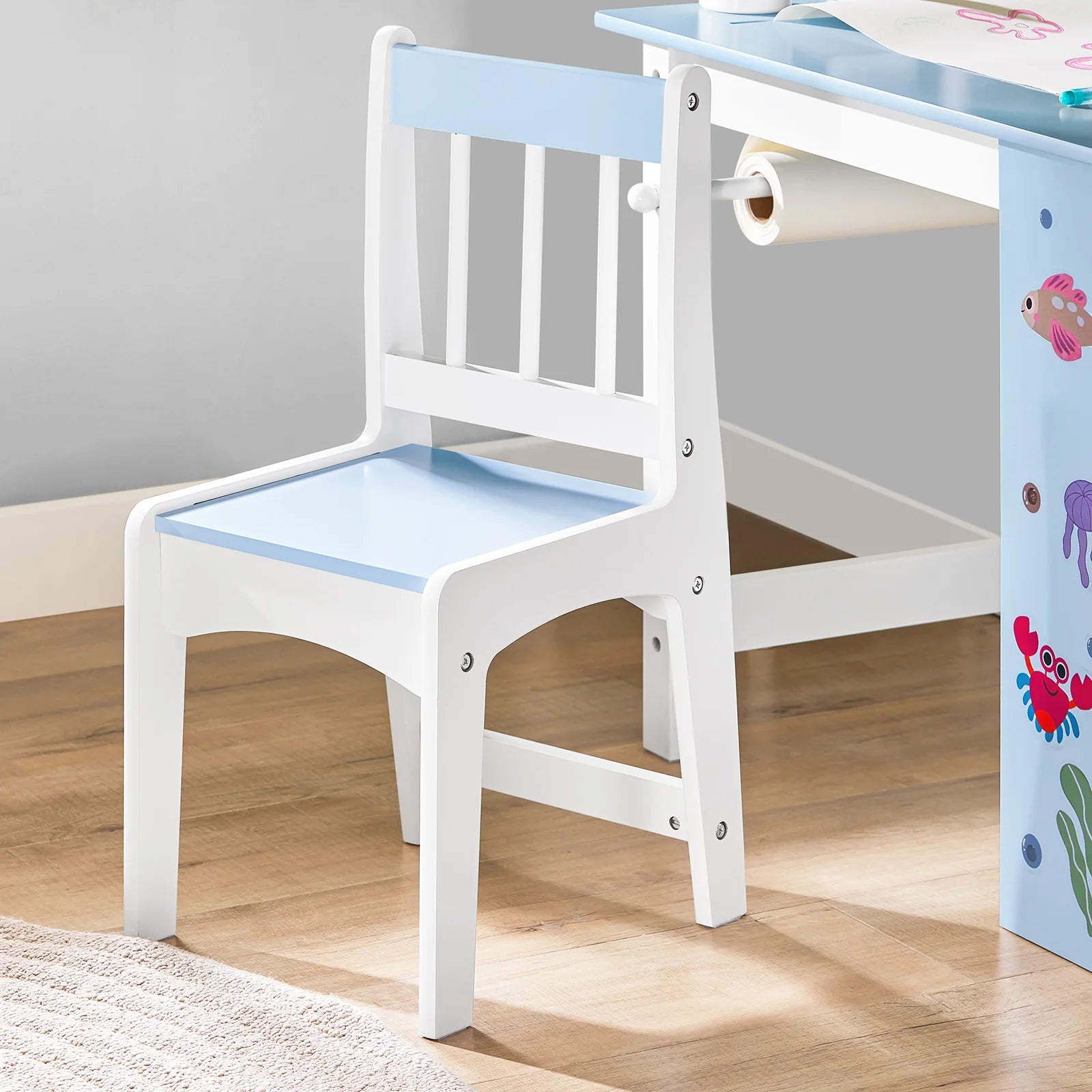• Designet til børn: Med sin nuttede design i blå og hvide farver vil sættet lyse op i ethvert børneværelse. Det leveres med personlige klistermærker, som barnet kan bruge til at sætte sit eget præg på bordet.