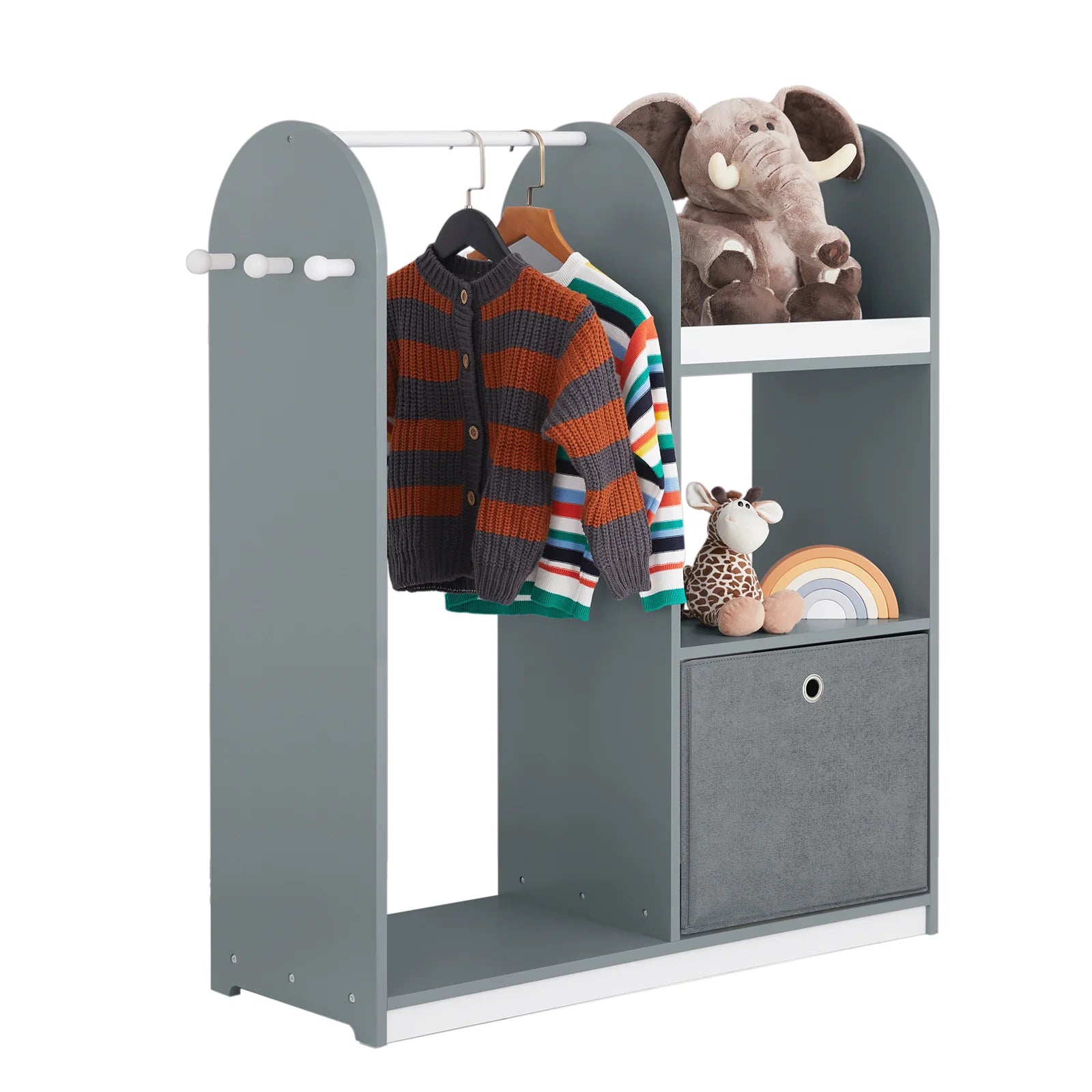 Skabet byder på en række smarte opbevaringsmuligheder, herunder en rummelig overflade, tre åbne hylder, en praktisk stofkurv, en bøjlestang og tre kroge. Dette giver dig mulighed for nemt at sortere og opbevare tøj, sko, legetøj, bøger og dekorationer, så alt har sin egen plads.