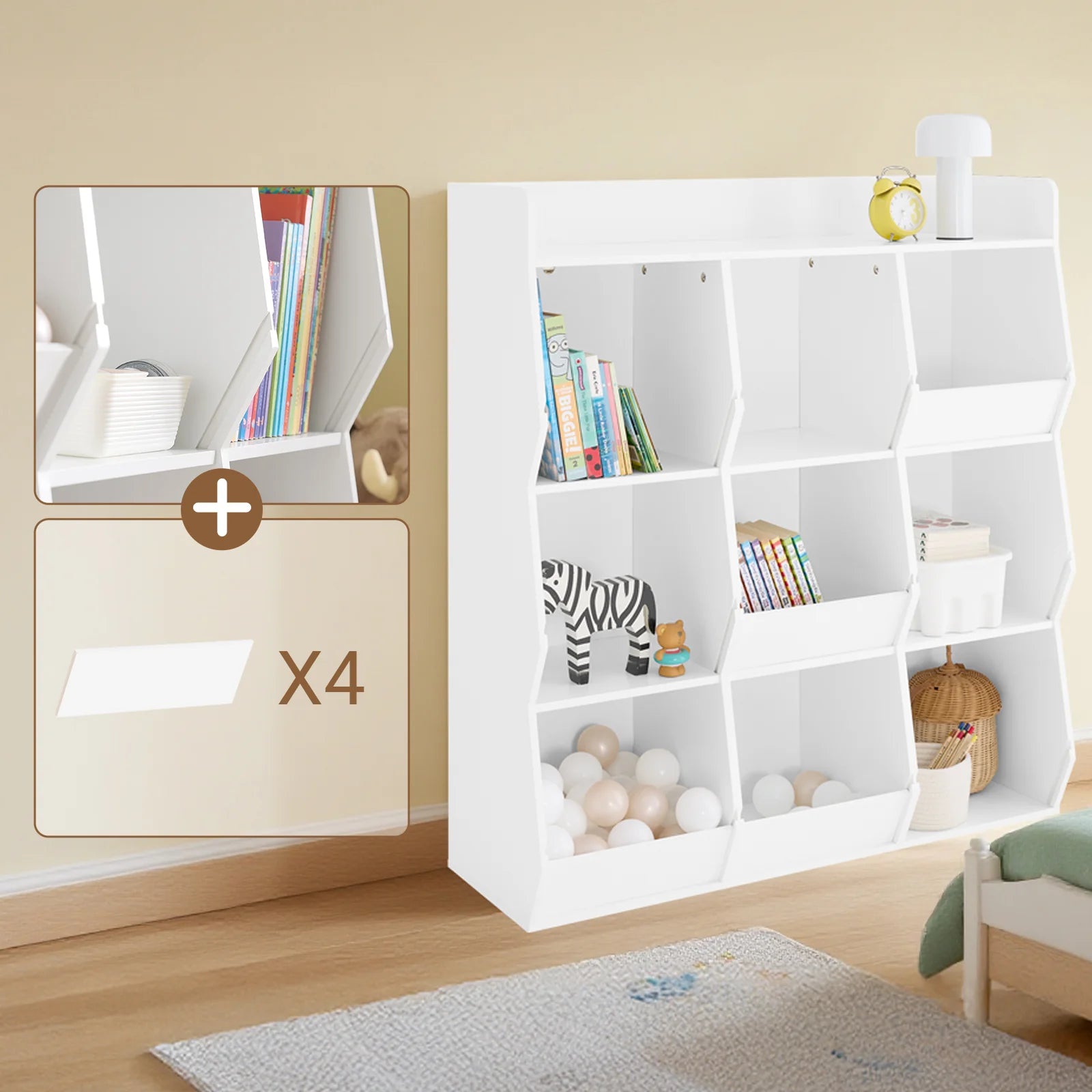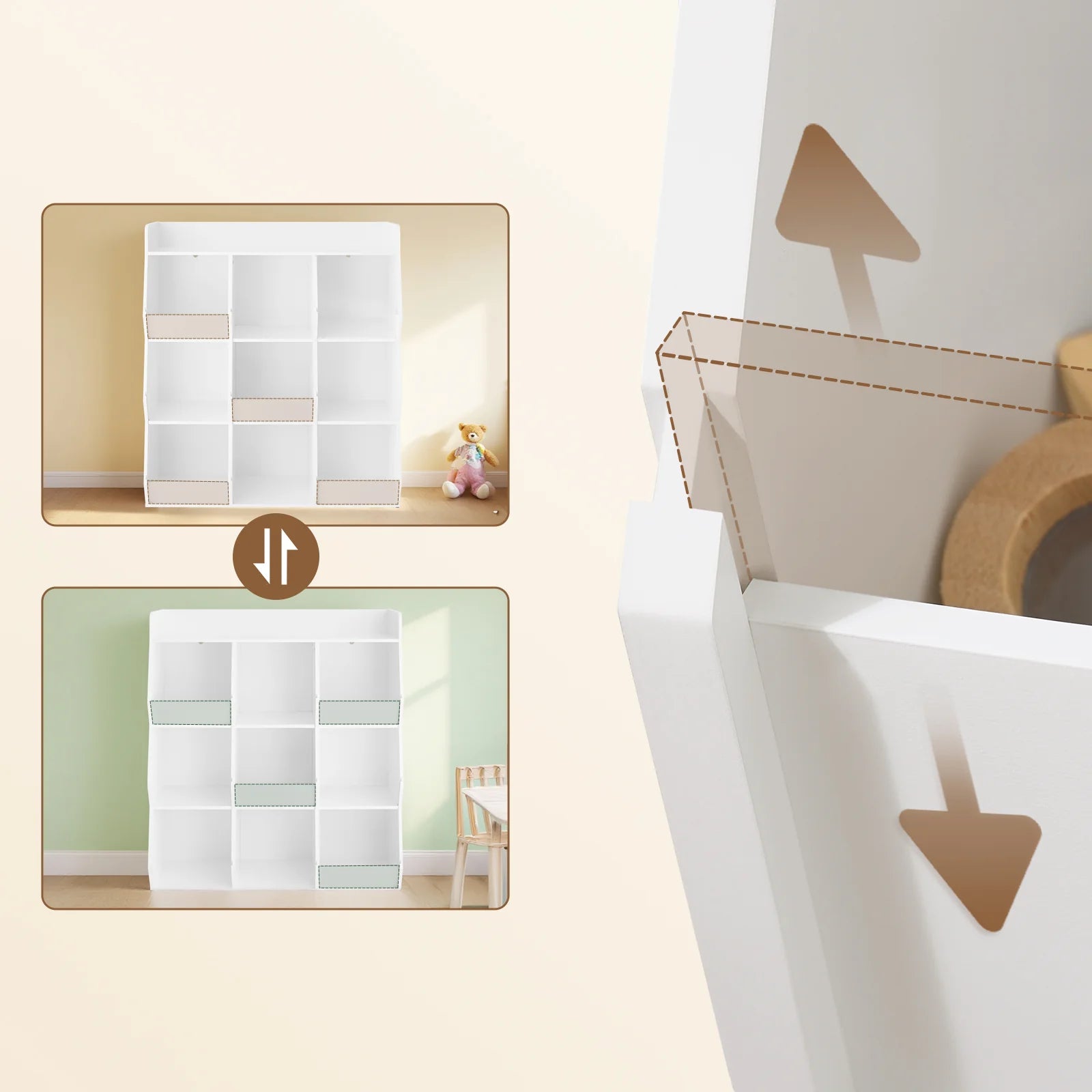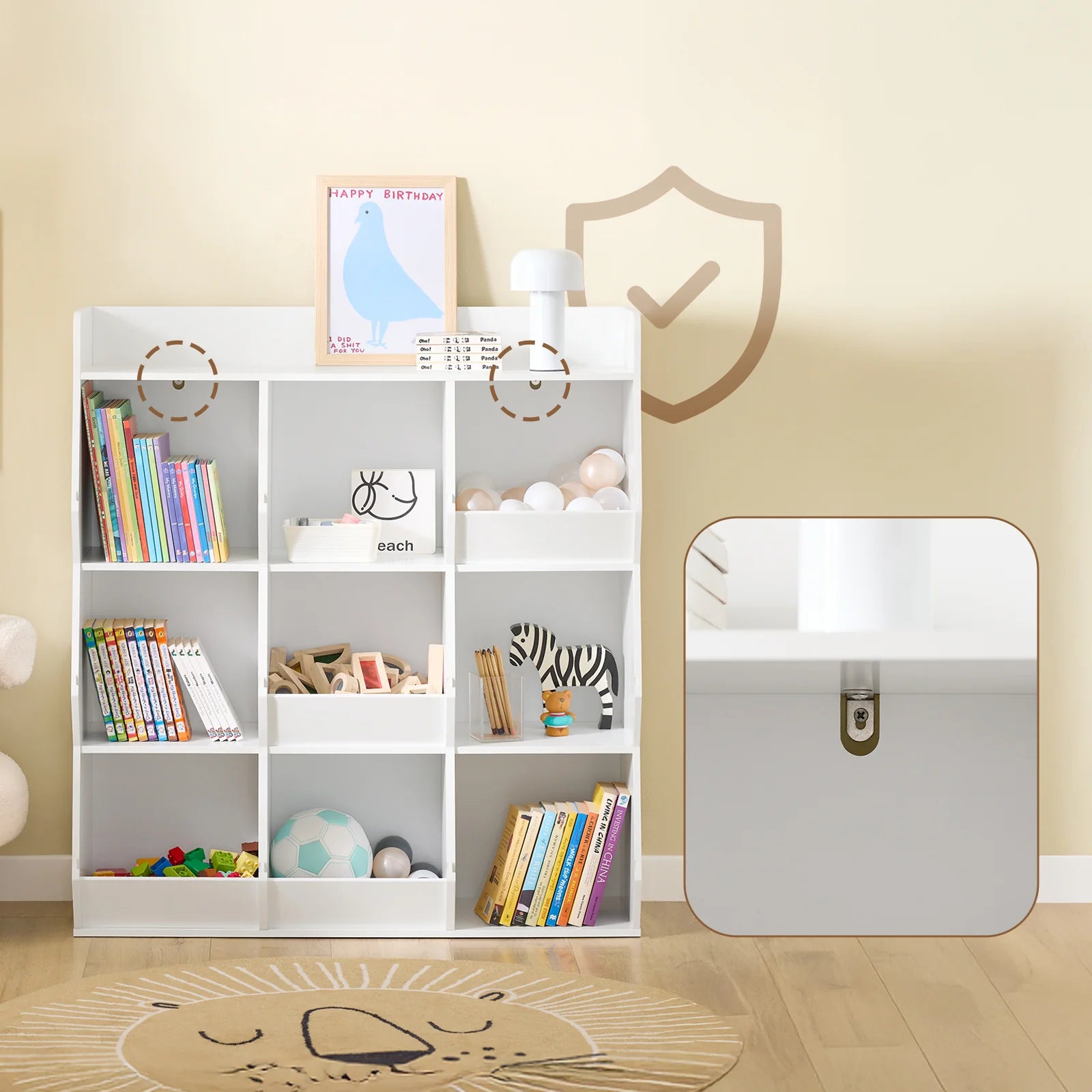 Med sine 9 åbne, let tilgængelige rum er denne bogreol ikke bare opbevaring – den er et pædagogisk redskab. Bøger, yndlingsbamser, fotos og legetøj får hver deres faste plads i de tre sektioner (venstre, midte, højre).