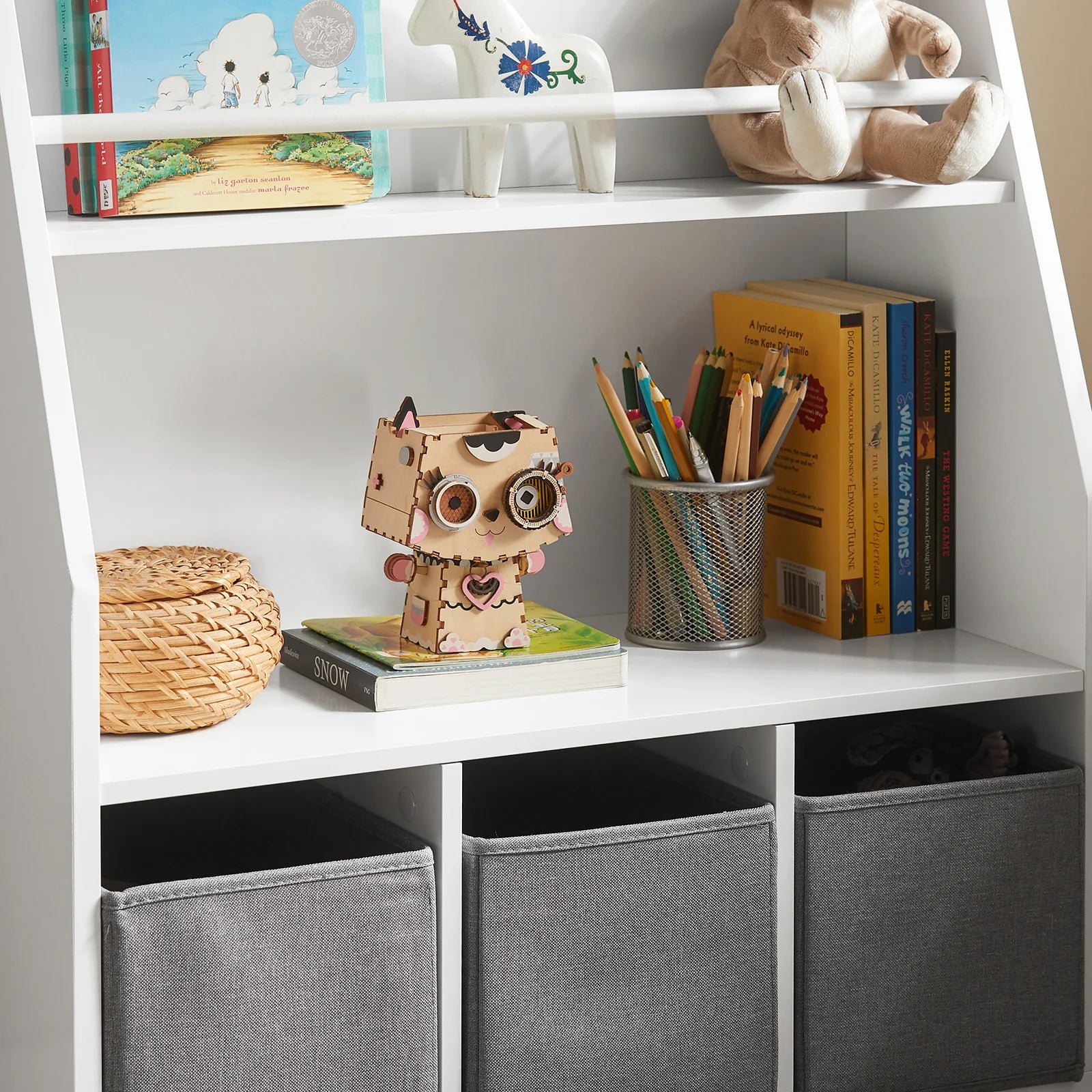 Giv børneværelset en stilfuld og organiseret opgradering med denne moderne opbevaringshylde. Det minimalistiske design passer ind i enhver indretning og skaber et ryddeligt og indbydende miljø. De to hylder øverst er perfekte til bøger i alle størrelser, mens det store opbevaringsrum i midten og de tre udtagelige stofskuffer giver masser af plads til legetøj og andre småting.