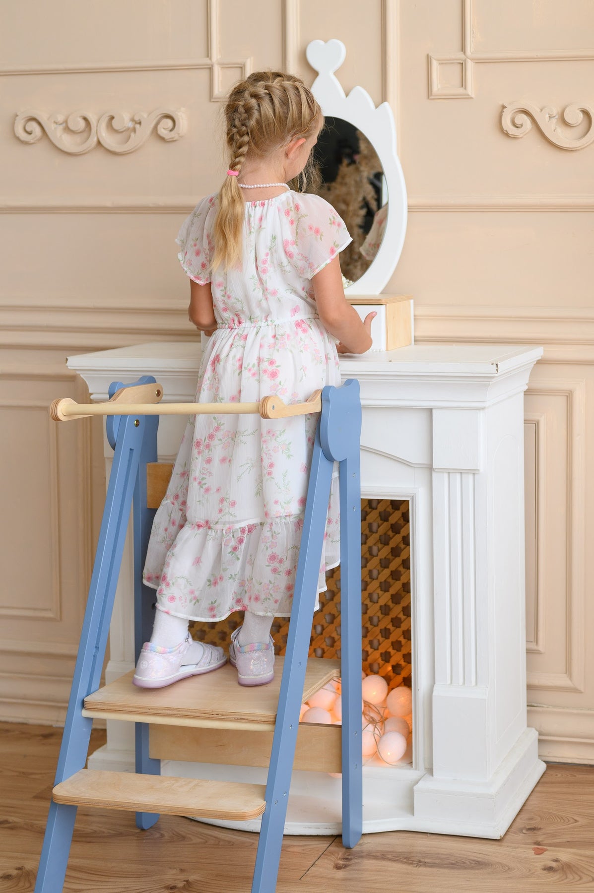 En praktisk, sammenklappelig, sikker og nem at bruge trappestige, designet til børn. Den ser fantastisk ud og er en perfekt hjælper for dit barn, som giver mulighed for at: