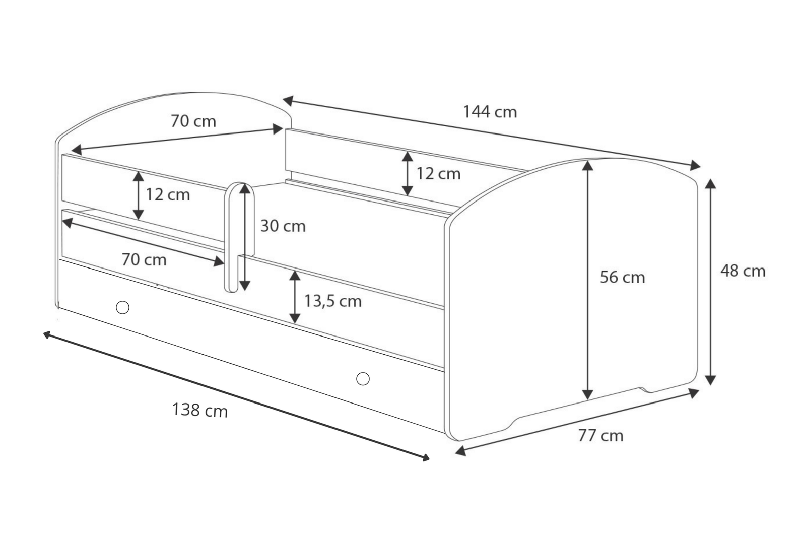 Kobi LUK børnesengen i størrelsen 140x70 cm er den ideelle løsning for forældre, der leder efter et funktionelt og æstetisk tiltalende møbel, der også vil glæde de yngste brugere. Sengen er dekoreret med et farverigt børneprint på forsiden og bringer et muntert og unikt præg til børneværelset, samtidig med at den bevarer en universel hvid farve, der er nem at matche med enhver indretning.