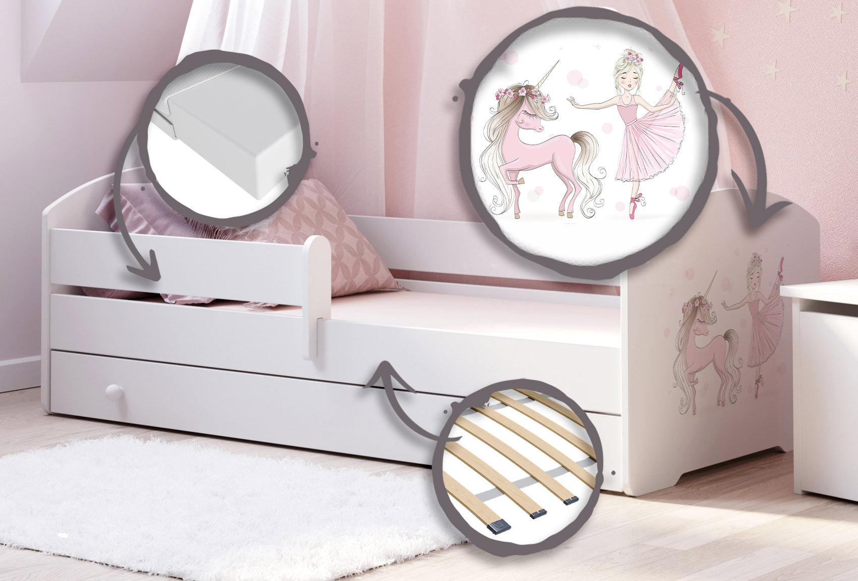 LUK-modellen kombinerer robust konstruktion, sikkerhed og komfort. Det bevægelige sengehest gør sengen velegnet til både mindre børn, der har brug for ekstra beskyttelse, og ældre børn, der kan bruge den efter behov. Den komfortable madras, der medfølger, er designet til en sund og afslappende søvn for dit barn, mens den rummelige skuffe giver praktisk opbevaring til sengetøj, legetøj eller tøj, hvilket hjælper med at holde rummet ryddeligt. Derudover minimerer de afrundede kanter og PVC-beskyttede kanter risikoen for skader og sikrer det højeste sikkerhedsniveau. Sengen er lavet af certificerede, holdbare materialer, hvilket ikke kun garanterer dens levetid, men også dens venlighed over for miljøet og dit barns helbred. Takket være det unikke print bliver møblerne rummets midtpunkt og kombinerer praktiske funktioner med dekorative kvaliteter.