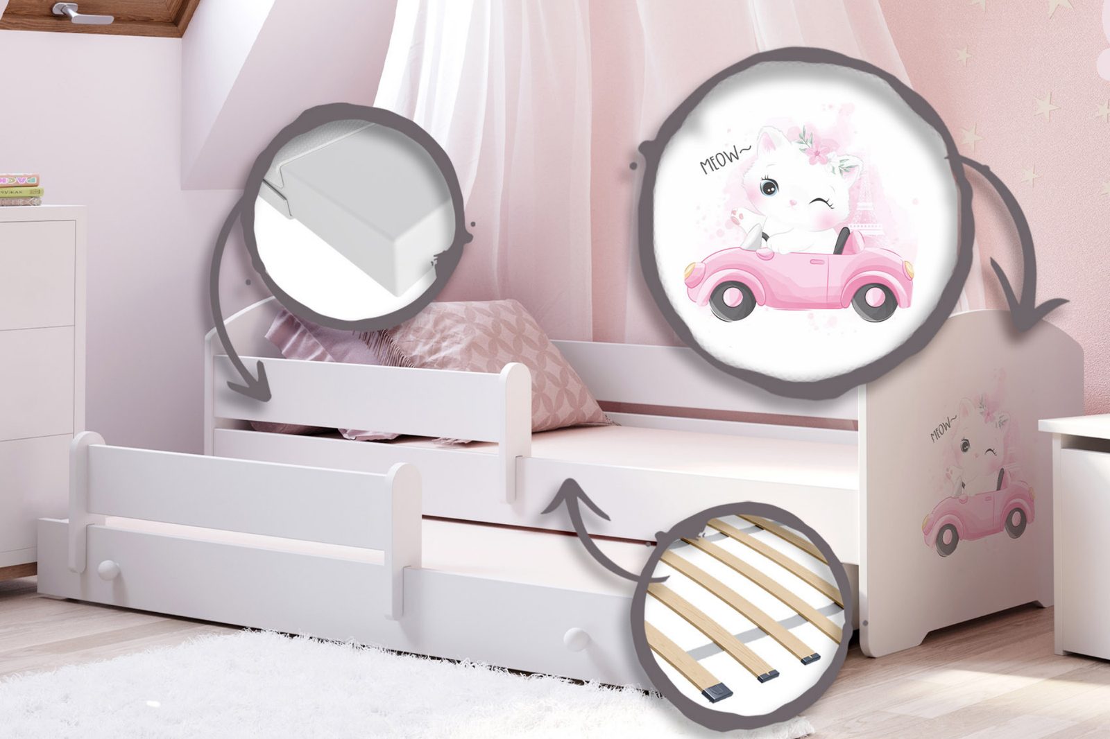 LUK II-modellen er en hvid Kobi-børneseng beriget med et muntert børneprint på forsiden, der perfekt kombinerer praktisk anvendelighed med æstetisk appel. Den indbyggede skuffe, der fungerer som ekstra soveplads, er den ideelle løsning til gæstebesøg eller søskendes overnatning sammen. Takket være det universelle hvide farveskema og det farverige print passer sengen perfekt ind i indretningen af både pige- og drengeværelser, hvilket giver den en unik karakter.