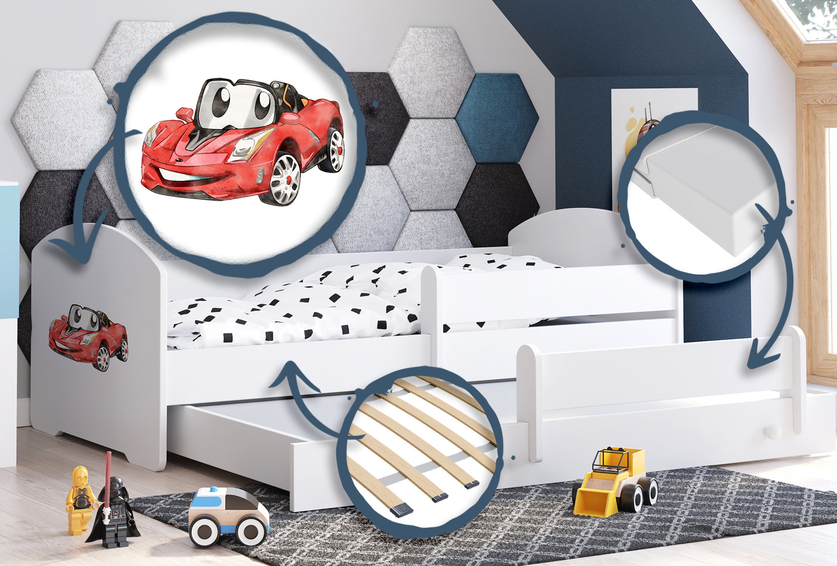 LUK II-modellen er en hvid Kobi-børneseng beriget med et muntert børneprint på forsiden, der perfekt kombinerer praktisk anvendelighed med æstetisk appel. Den indbyggede skuffe, der fungerer som ekstra soveplads, er den ideelle løsning til gæstebesøg eller søskendes overnatning sammen. Takket være det universelle hvide farveskema og det farverige print passer sengen perfekt ind i indretningen af både pige- og drengeværelser, hvilket giver den en unik karakter.