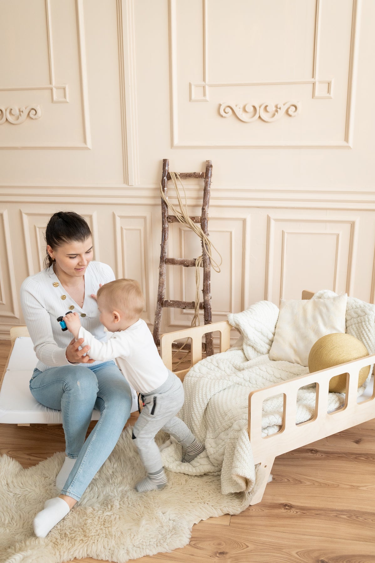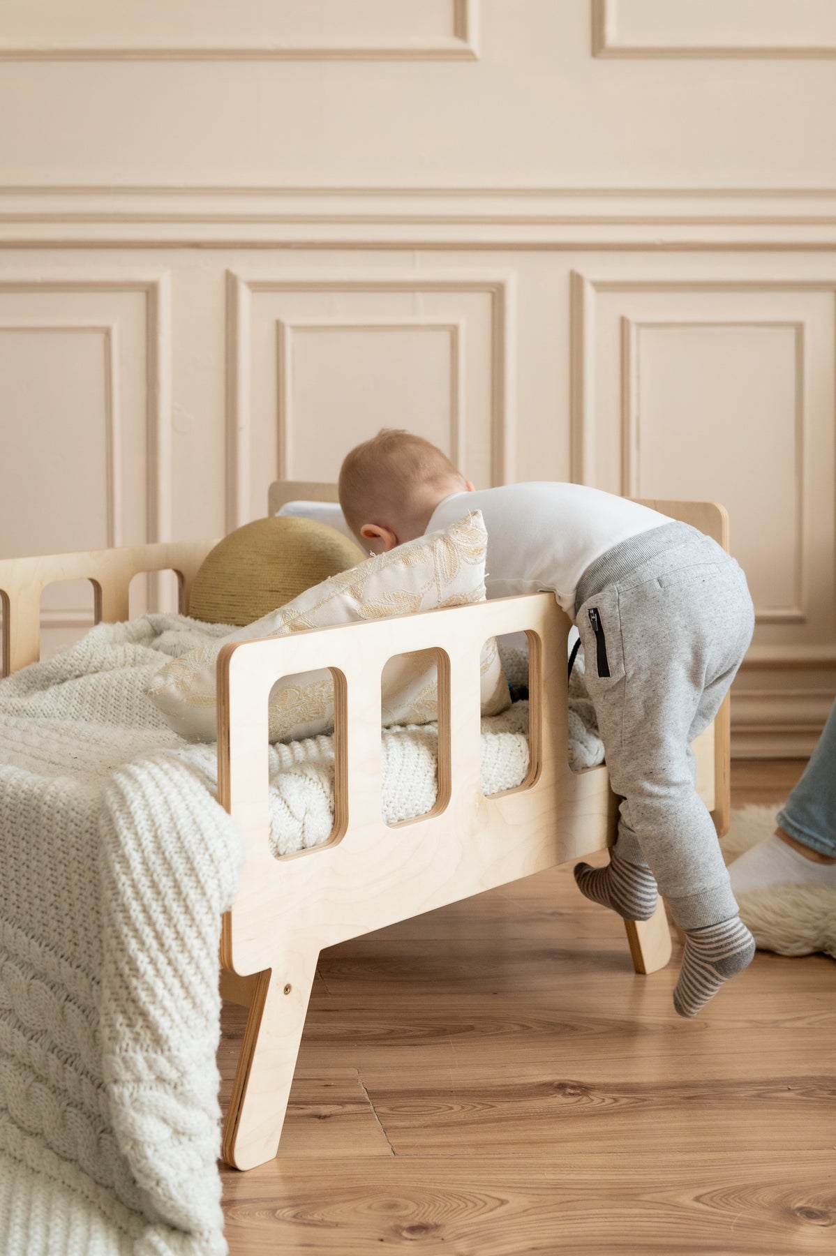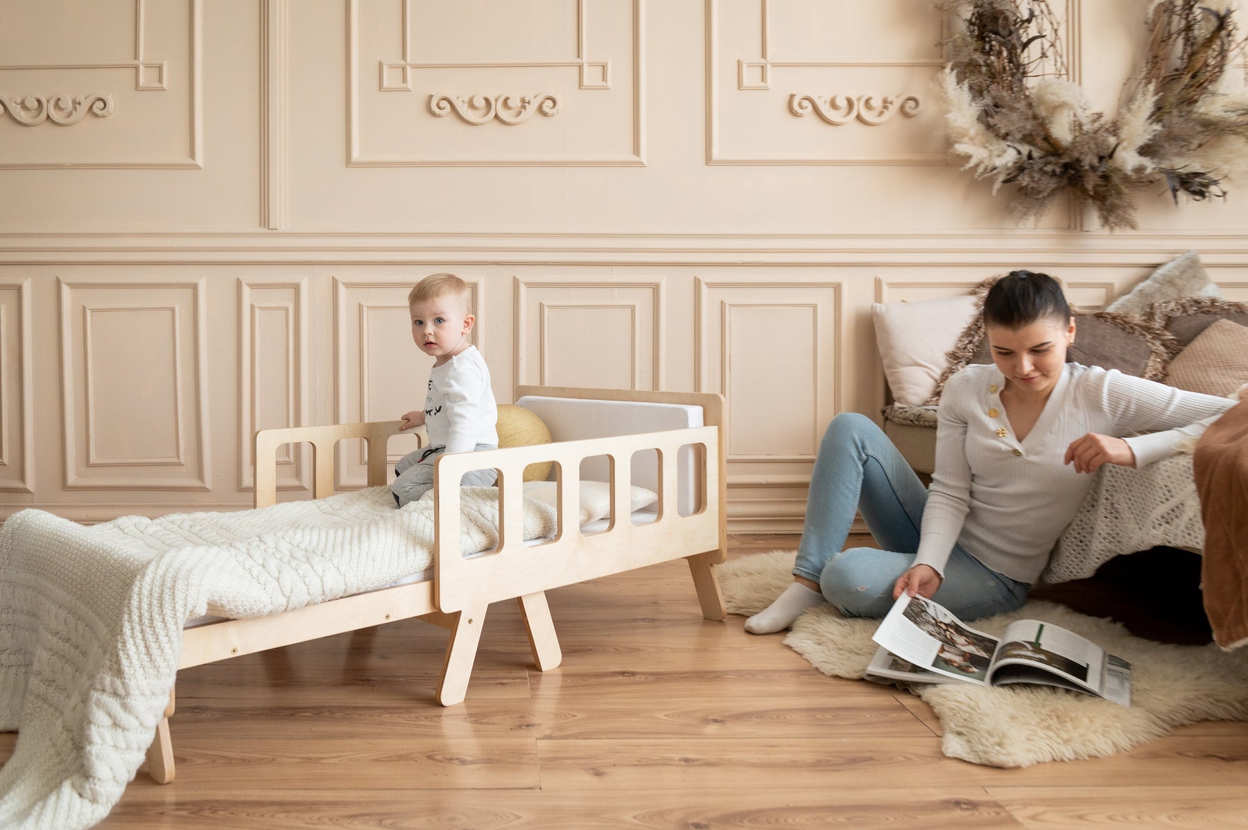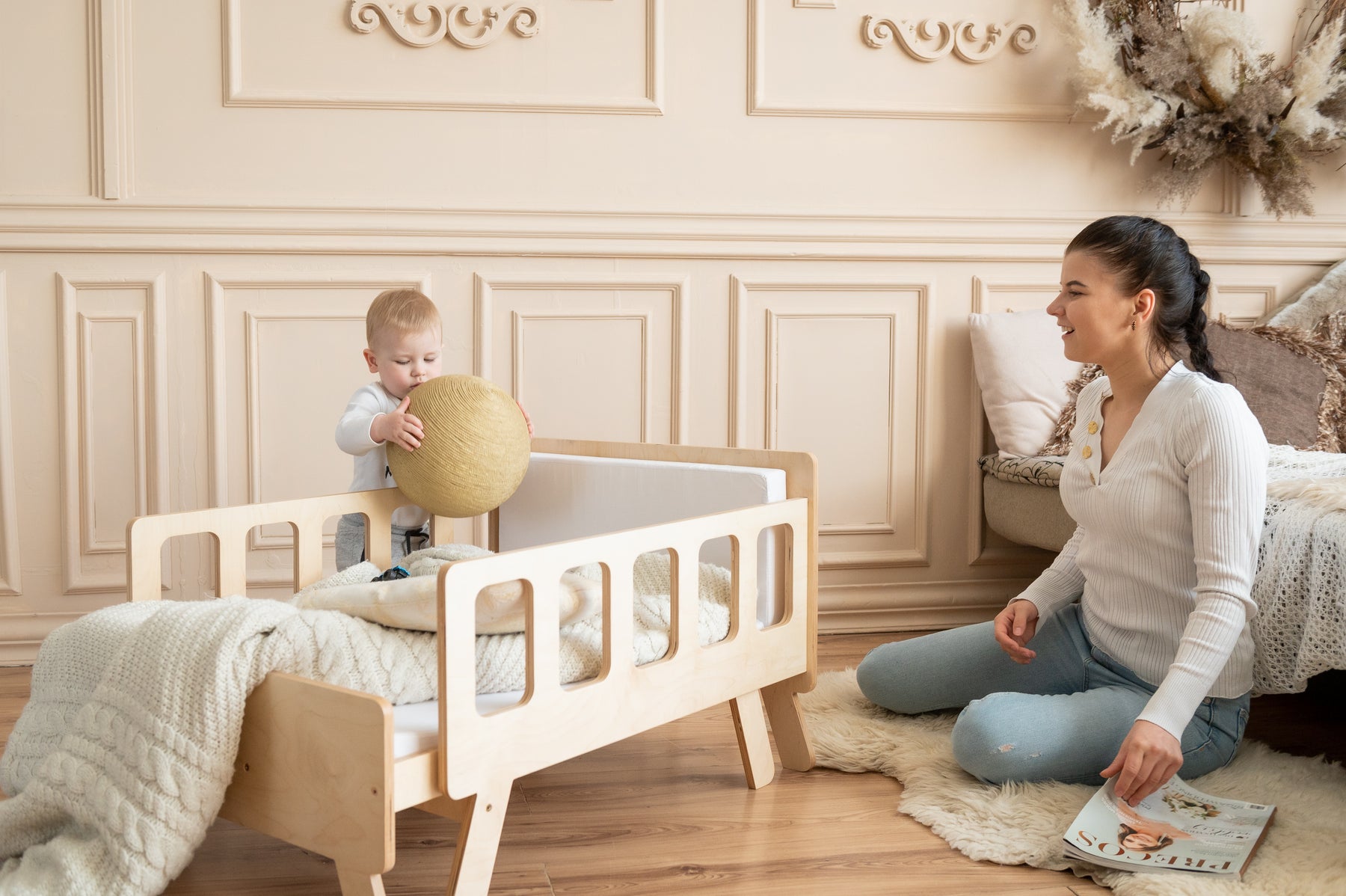 Smart børneseng der vokser med, naturfarvet