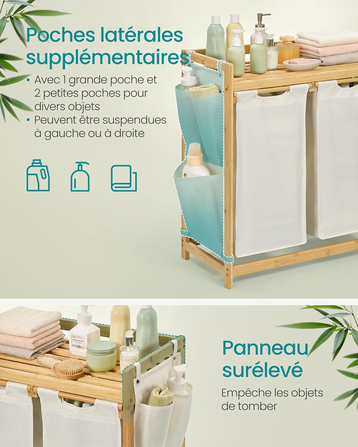 Kurvens robuste ramme i bambus af høj kvalitet sikrer, at den står stabilt. Hele kurven kan bære op til 32 kg, mens hylden alene kan bære op til 18 kg. Hver af de to vaskeposer kan desuden holde op til 7 kg tøj.