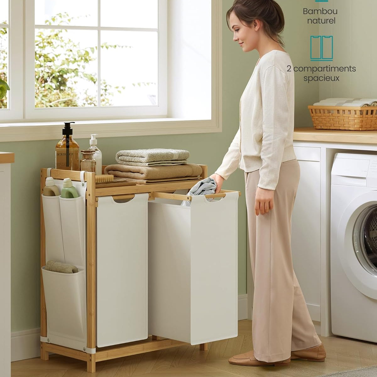 Vasketøjskurv med 2 rum, bambus, 100L, hylde, cremefarvet