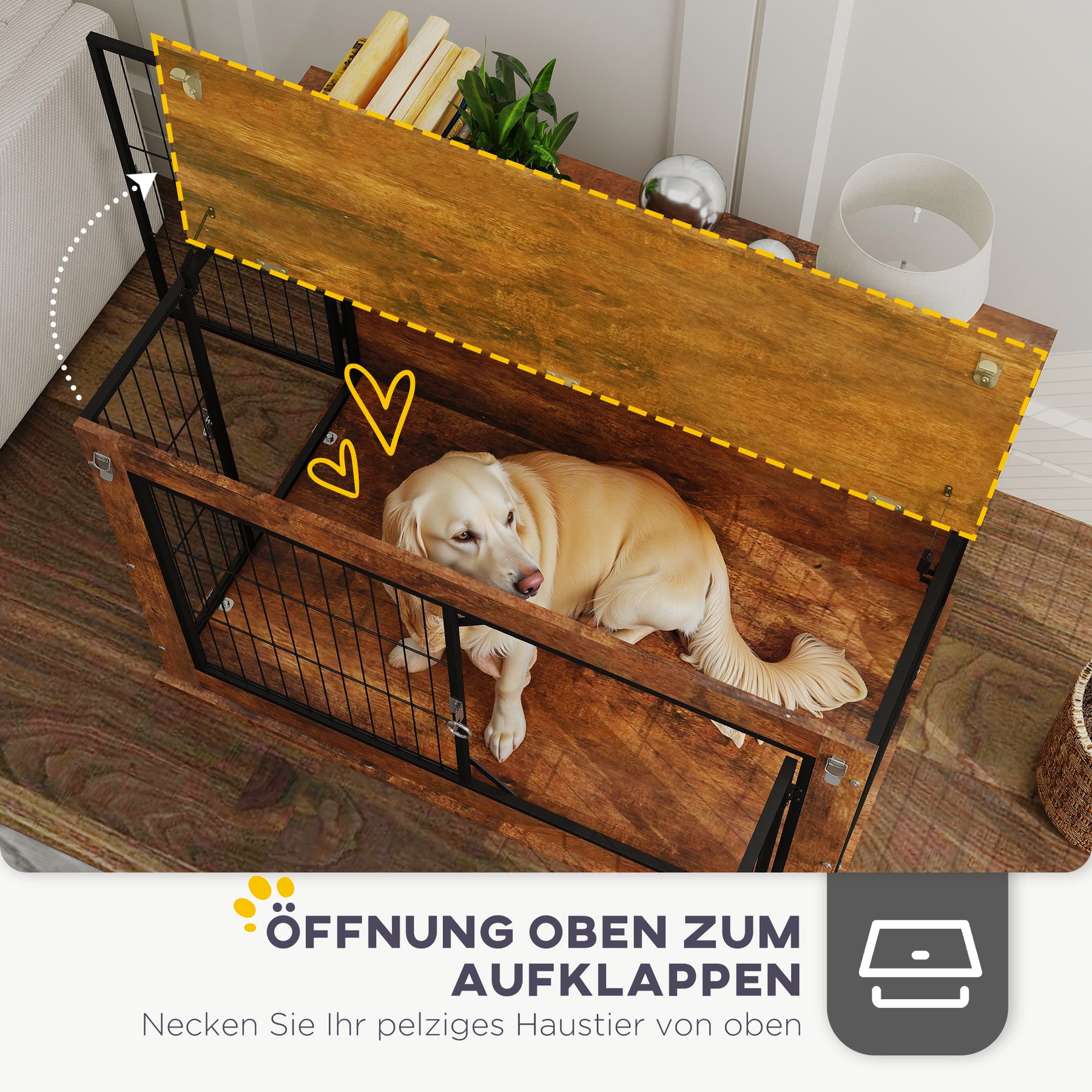 Oplev fordelene ved hundeburet til hjemmet: Stilfuldt og sikkert. Den øverste åbning gør det nemt at berolige din hund under rejsen, mens to døre med sikre lukninger og ventilation på tre sider sikrer komfort og nem tilgængelighed. Ideel til store hunde, som et tilflugtssted derhjemme eller som transportkasse på rejser.