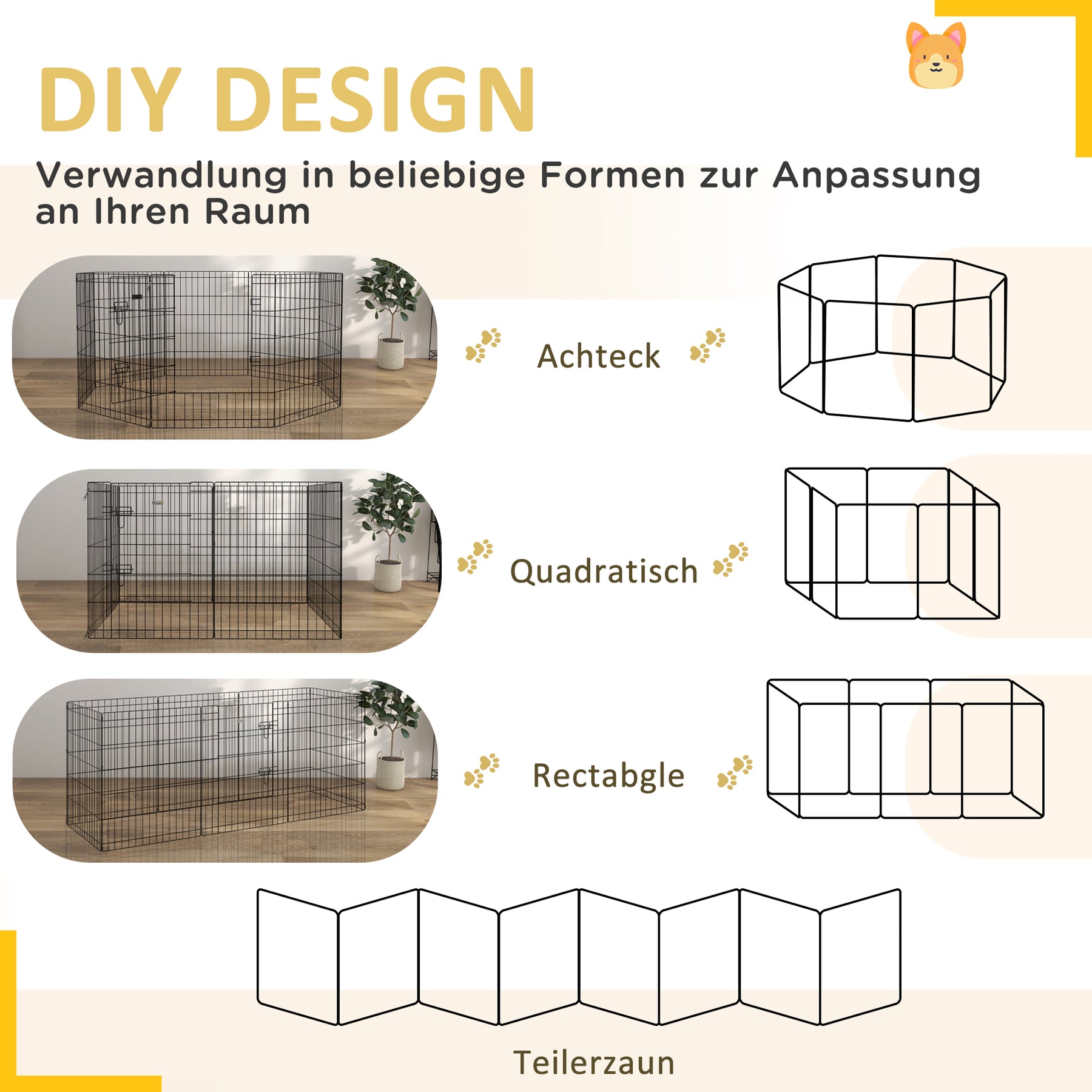 Kravlegården gør legetiden mere sikker for mindre kæledyr. Den er fleksibel i brug og kan formes til en ottekant, firkant eller rektangel, så den tilpasser sig ethvert rum eller enhver have. For mere plads kan den nemt kombineres med en anden, hvilket skaber ekstra lege- og afslapningsrum.