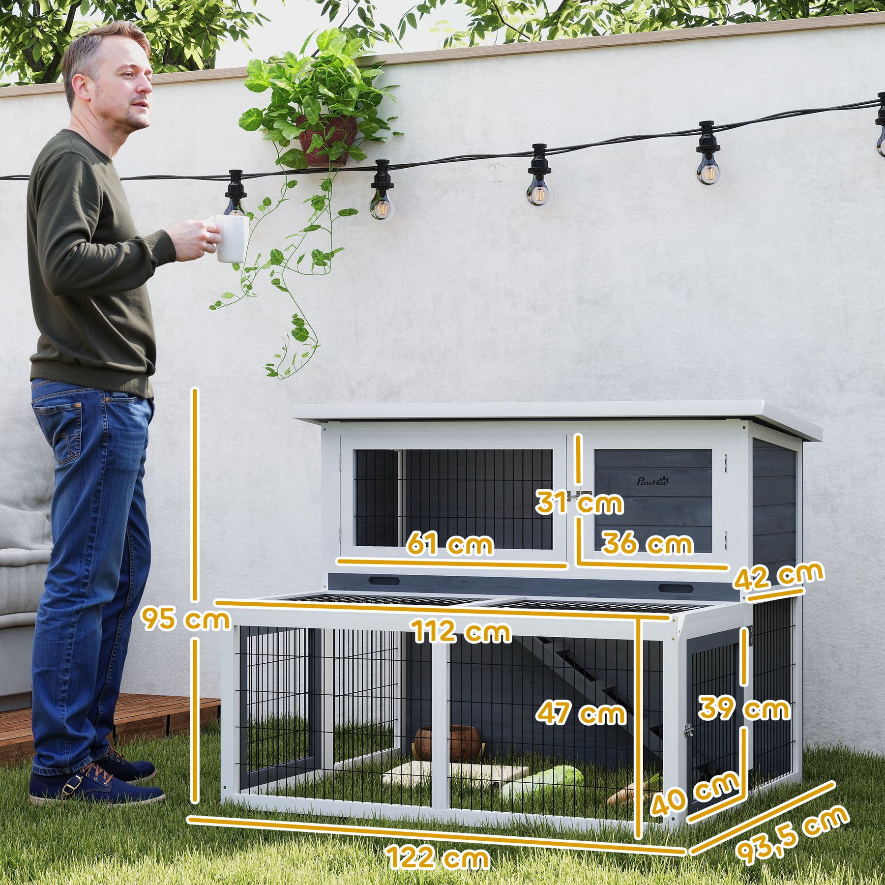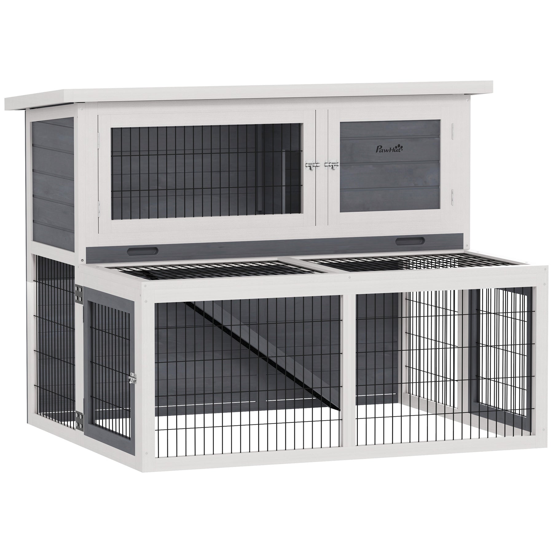 Opdag dette vintersikrede udendørs kaninbur, der tilbyder et komfortabelt, toetagers hjem til dine pelsede venner. Med et rummeligt hovedområde til afslapning og en lavere motionskasse, får 2-3 kaniner masser af plads til at bevæge sig rundt. Rengøringen er nem takket være den hængslede top og den udtrækkelige bakke, og flere døre giver dig adgang til dine kaniner når som helst.