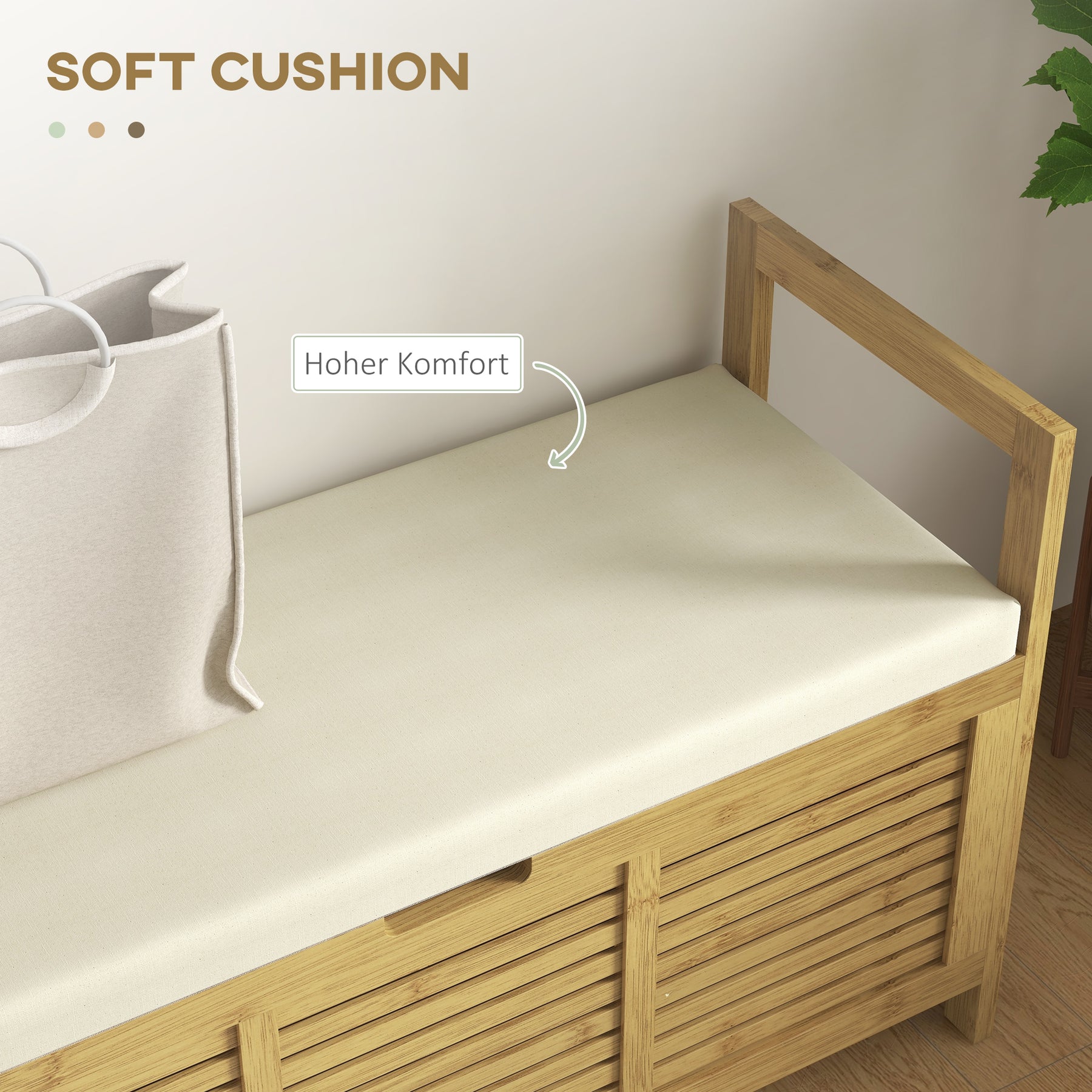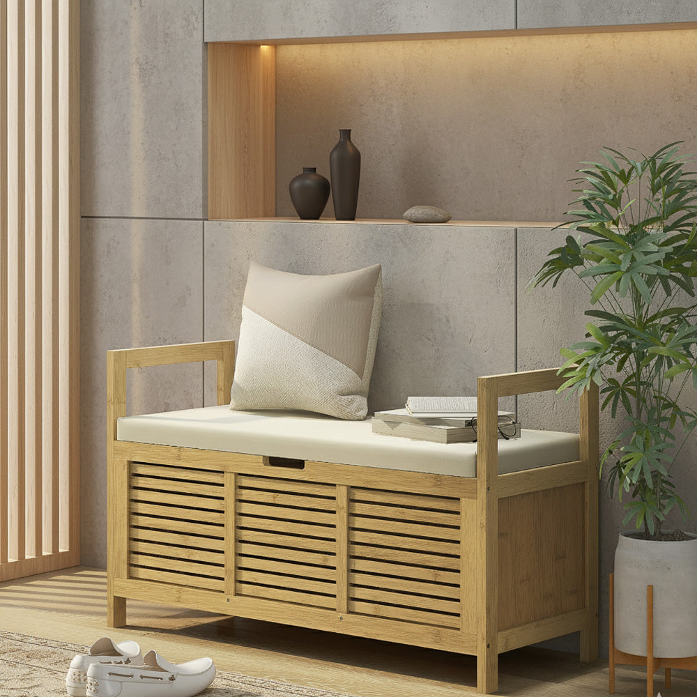 Organiser din entré nemt med denne bambus bænk, der med sit moderne look komplementerer enhver indretning. Det skjulte opbevaringsrum giver plads til tasker, hatte, nøgler og meget mere, så du kan skabe orden i dit hjem. Det polstrede sæde sikrer komfort, når du tager dine sko på, inden du forlader huset.