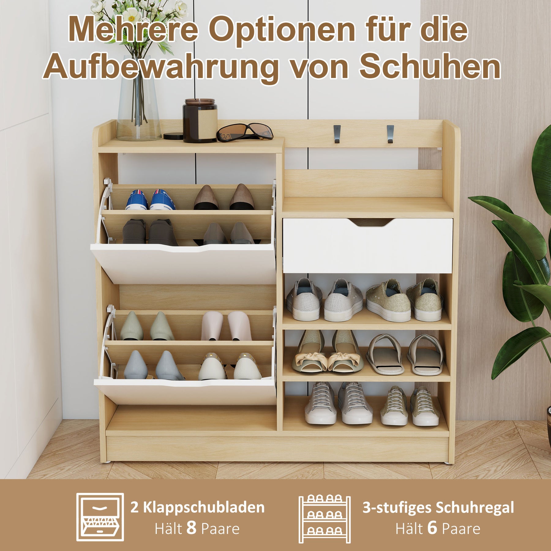 Skoreol til entré, skoskab med vippeskuffer, åbne hylder, 4 kroge, til op til 14 par sko, naturlig