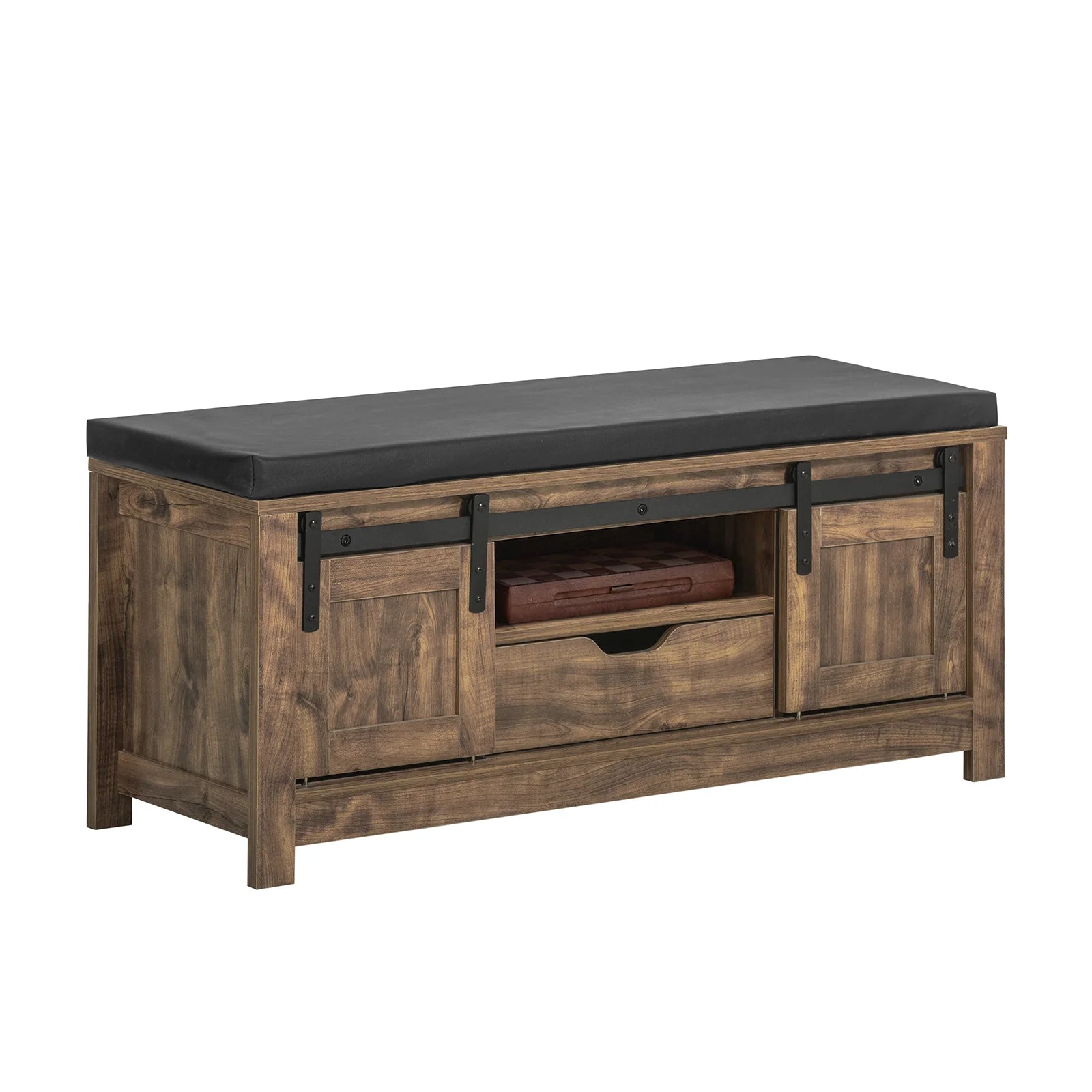 Under sædet finder du en smart opbevaringsløsning. Tre rum med skydelåger giver dig mulighed for at gemme skoene væk i ét område, mens du udstiller pæne genstande i et andet. De justerbare hylder i siderne og den centrale skuffe og hylde giver dig masser af plads til at organisere alle dine ejendele. Skobænken er fremstillet af robust spånplade, der sikrer holdbarhed og stabilitet.