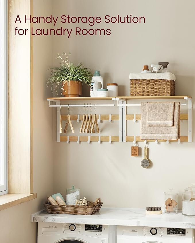 De 10 aftagelige kroge sidder i to rækker og kan justeres efter dine behov. Flyt dem rundt for at give plads til tasker, frakker eller andre ting i forskellige størrelser. Den robuste konstruktion i stål og spånplade sikrer, at knagerækken kan bære op til 20 kg på hylden, 5 kg pr. krog og 15 kg på bøjlestangen, hvilket giver en imponerende samlet bæreevne på 45 kg.