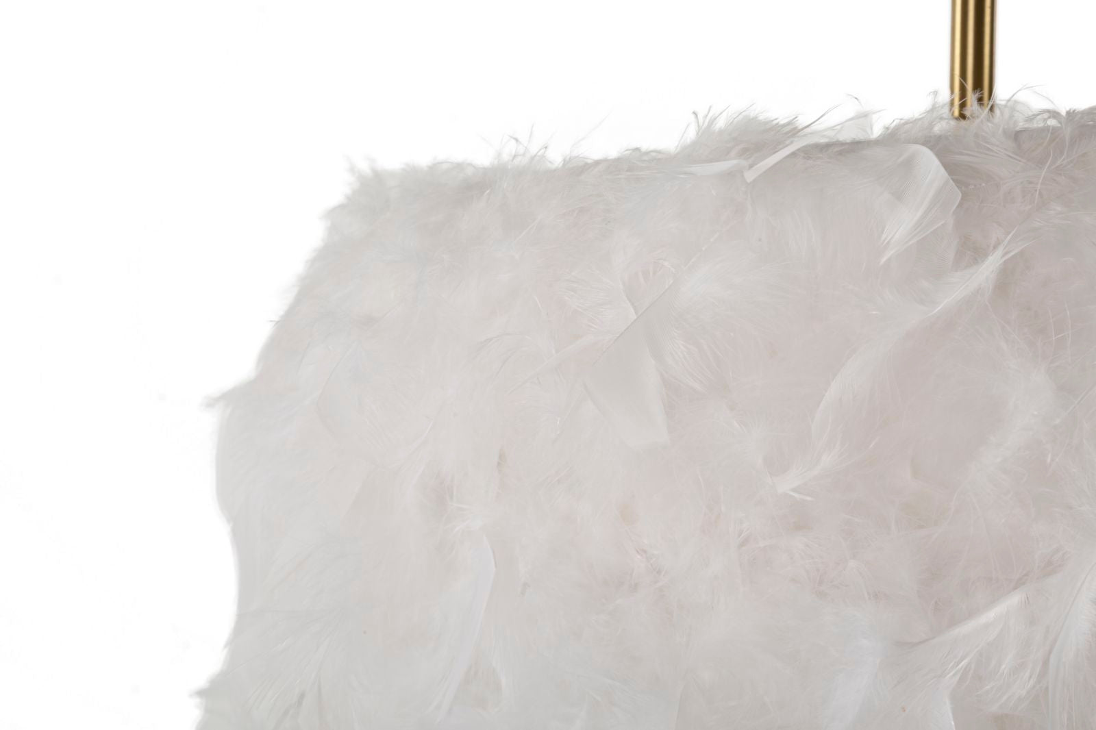 Med sit buede og lineære design i gyldent metal og en elegant skærm af syntetiske fjer, tilfører lampen et luksuriøst og eksklusivt touch til ethvert rum. Den gyldne farve giver et stilfuldt og eksklusivt udtryk, der passer perfekt til en elegant indretning.